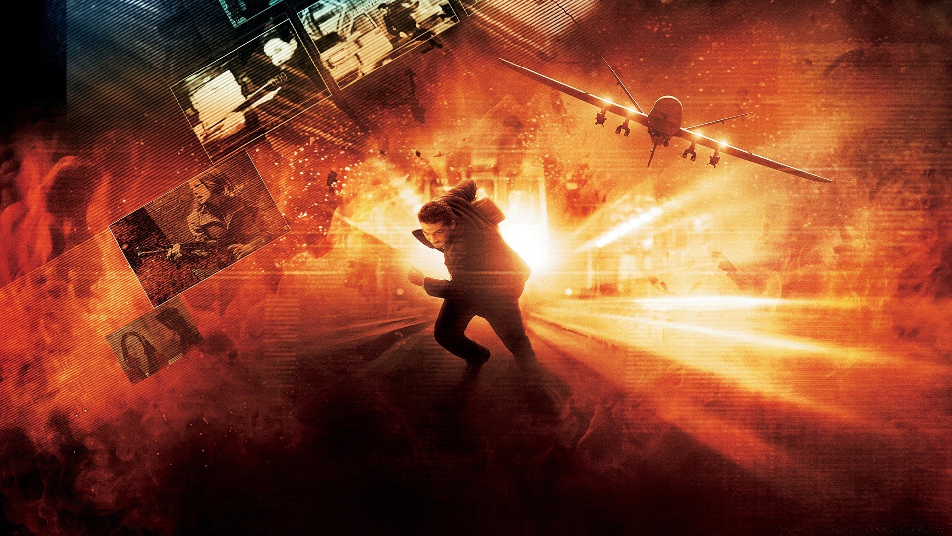 Héros du film avec un pistolet dans les mains sur le fond de la ville moderneHéros du film avec un pistolet dans les mains sur le fond de la ville moderne