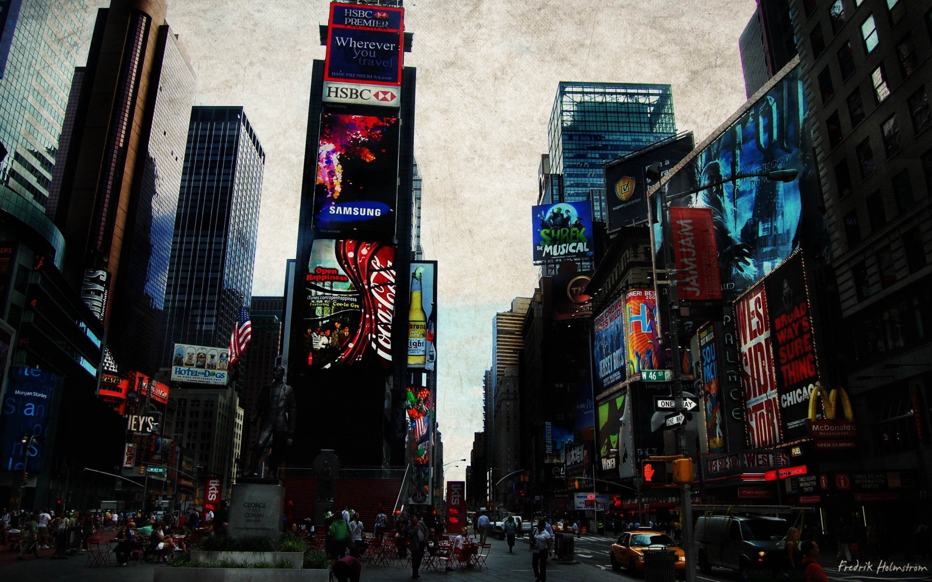 Vue des gratte-ciel avec d'énormes écrans publicitaires
