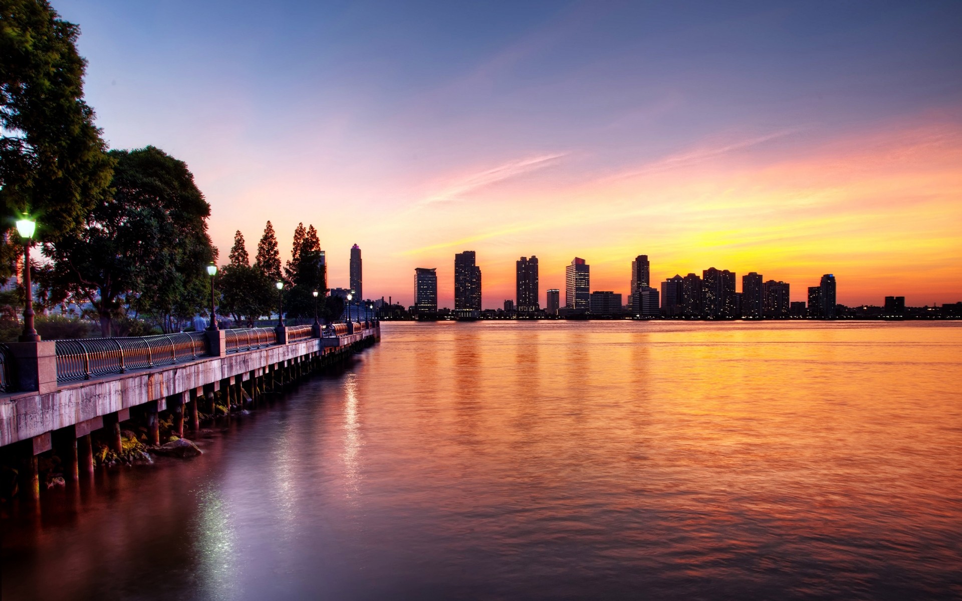 Paysage urbain avec des immeubles de grande hauteur sur fond de coucher de soleilPaysage urbain avec des immeubles de grande hauteur sur fond de coucher de soleil