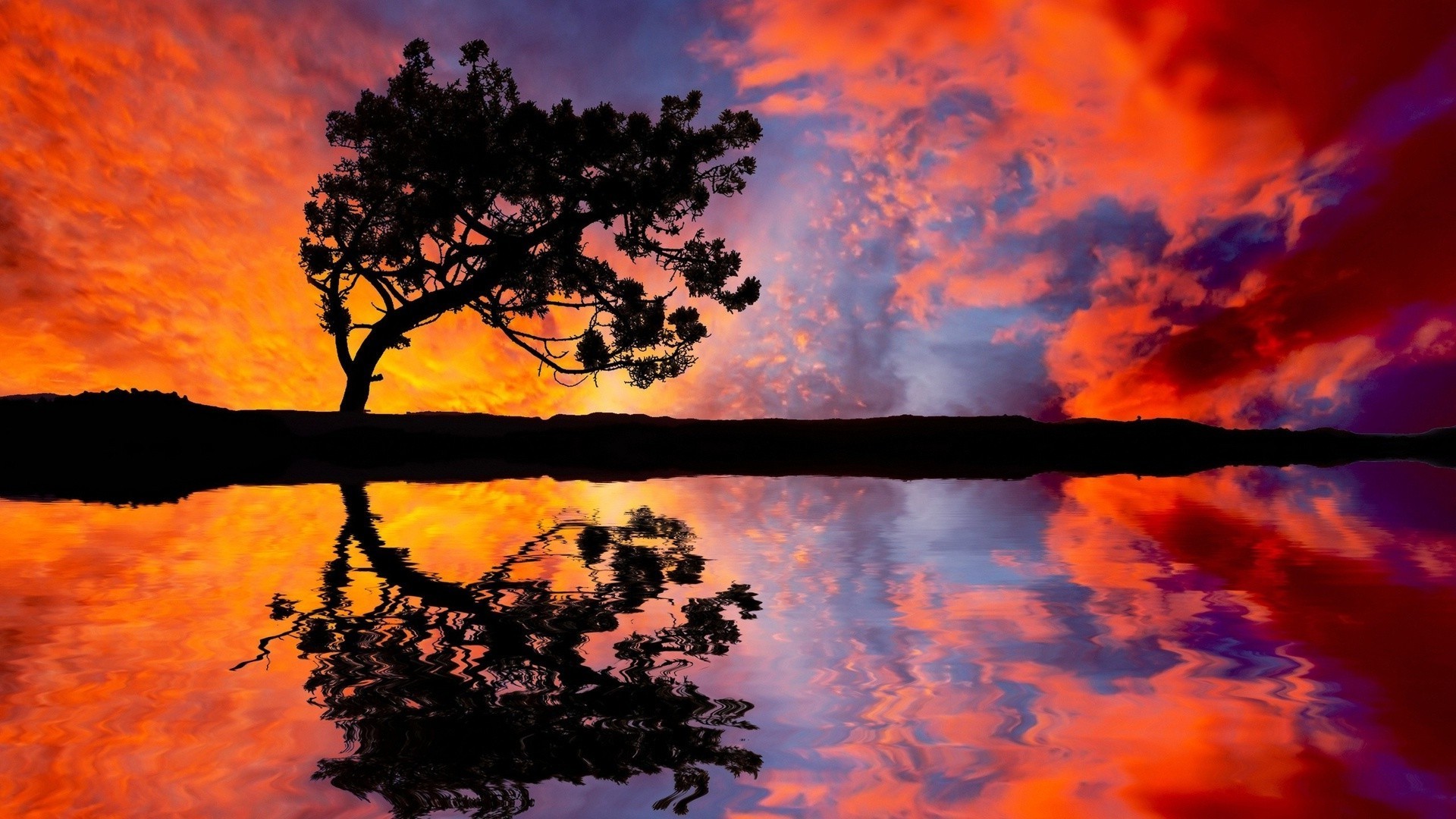 Coucher de Soleil écarlate dans la soirée au bord de l'eau