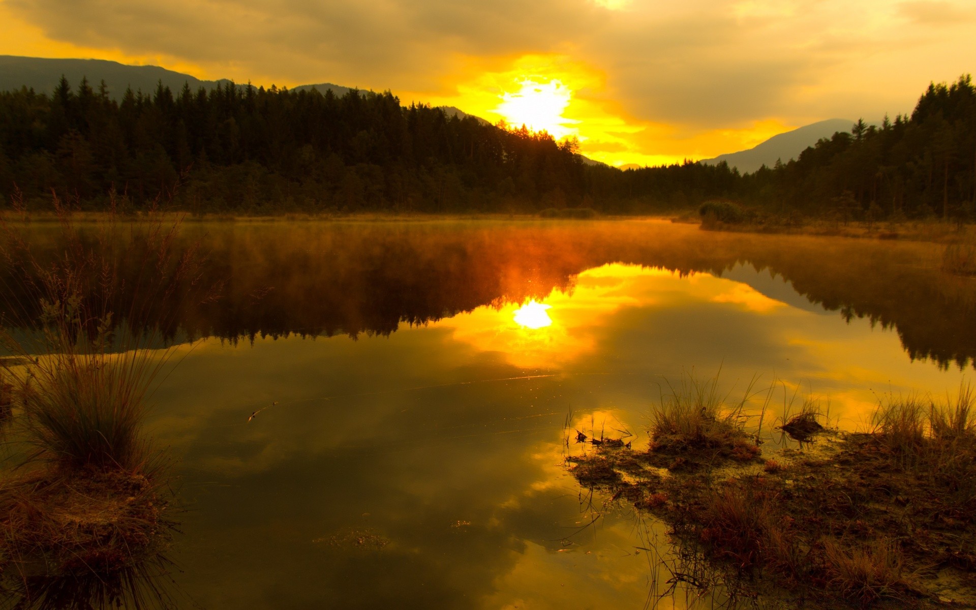 Reflet du coucher de soleil sur une rivière tranquilleReflet du coucher de soleil sur une rivière tranquille