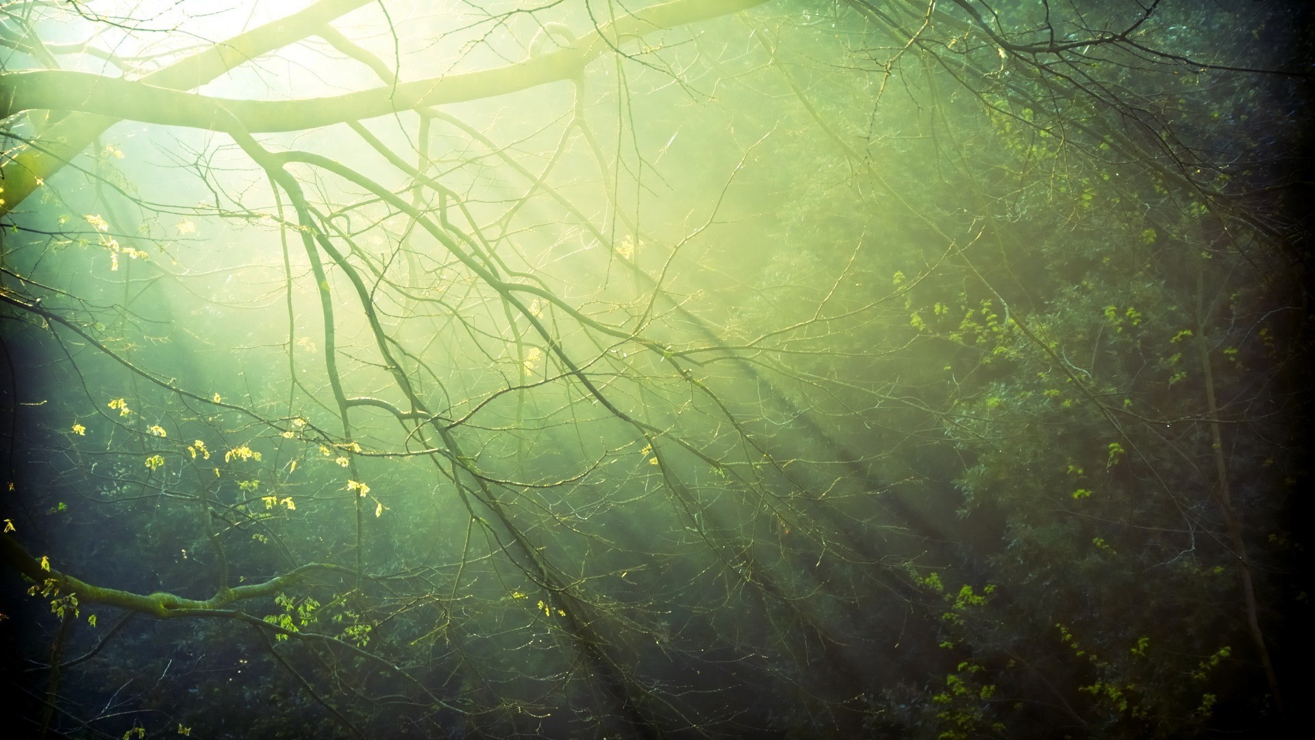 Les rayons du soleil à l'aube à travers les branches des arbres