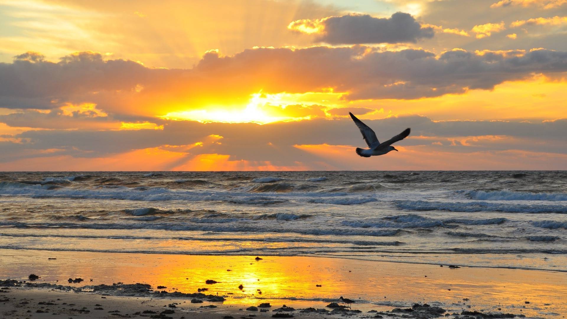 Oiseau vole sur fond de coucher de soleil et de la mer