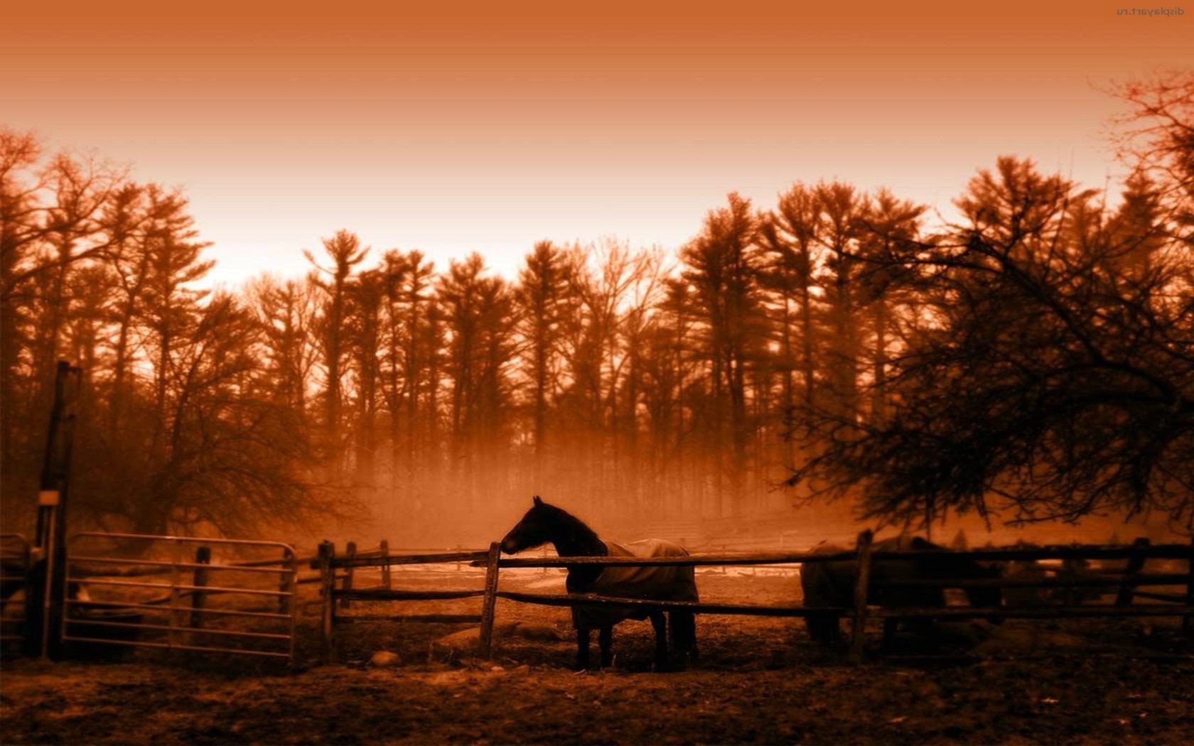 Chevaux marchant au coucher du soleil près des arbresChevaux marchant au coucher du soleil près des arbres