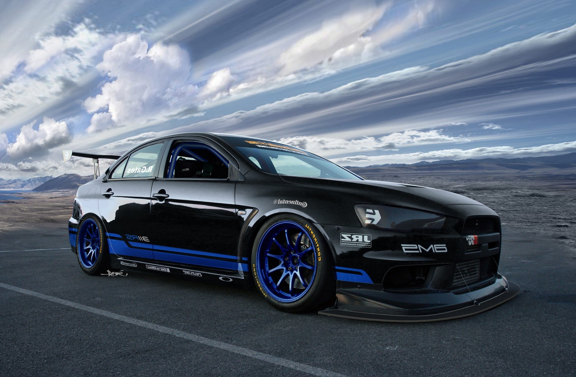 Voiture de course noire avec de beaux disques sur fond de tempêteVoiture de course noire avec de beaux disques sur fond de tempête