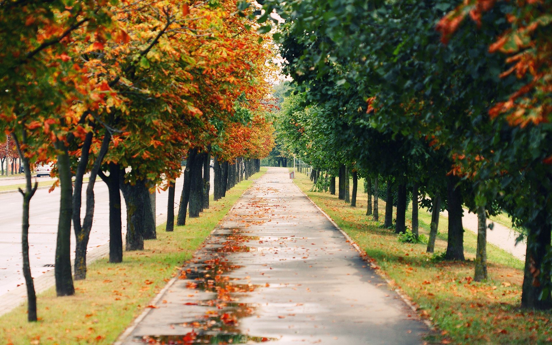 Route dans la forêt d'automne et la chute des feuilles rouges