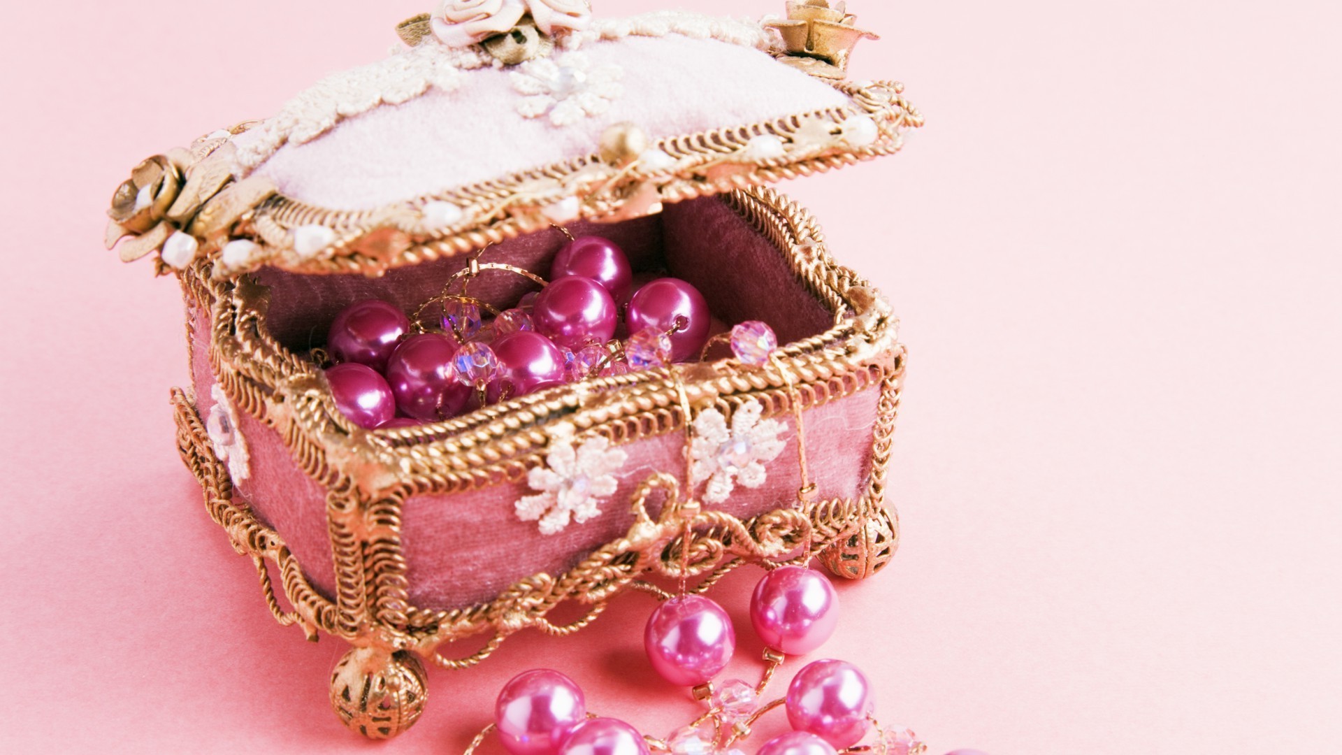 Boîte à bijoux rose avec perles roses