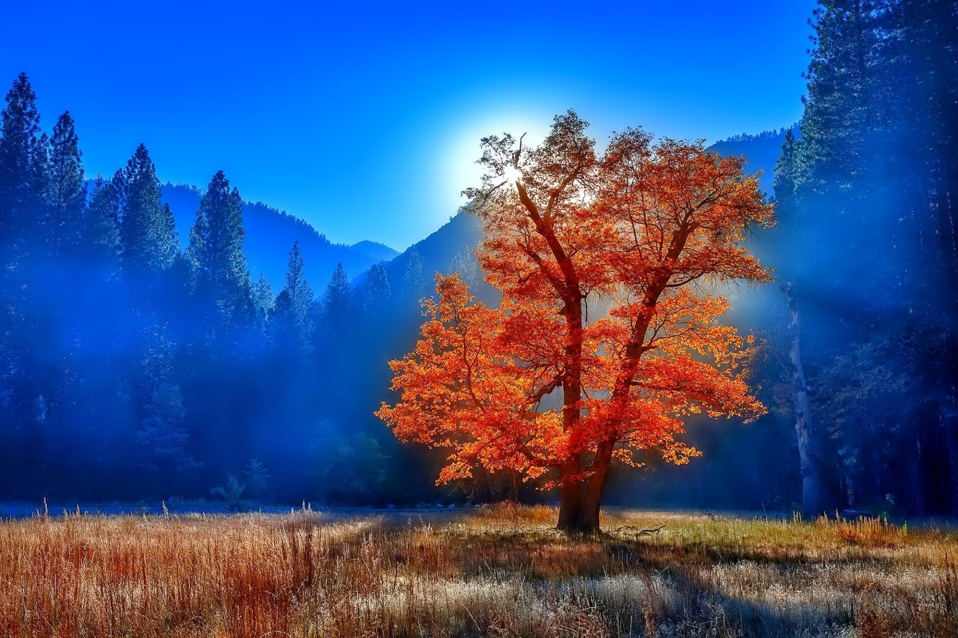 Arbre avec des feuilles jaunies dans la brume de brouillard dans la forêt dans les montagnes