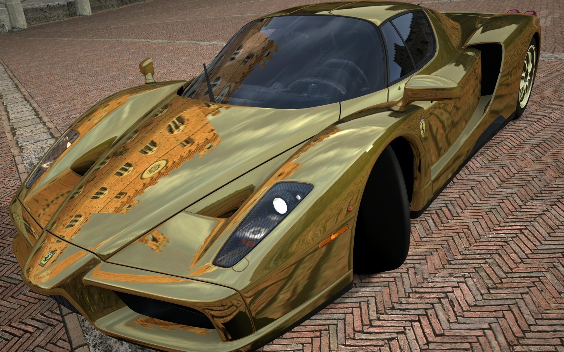 Porsche dorée avec réflexion sur le capot du bâtiment
