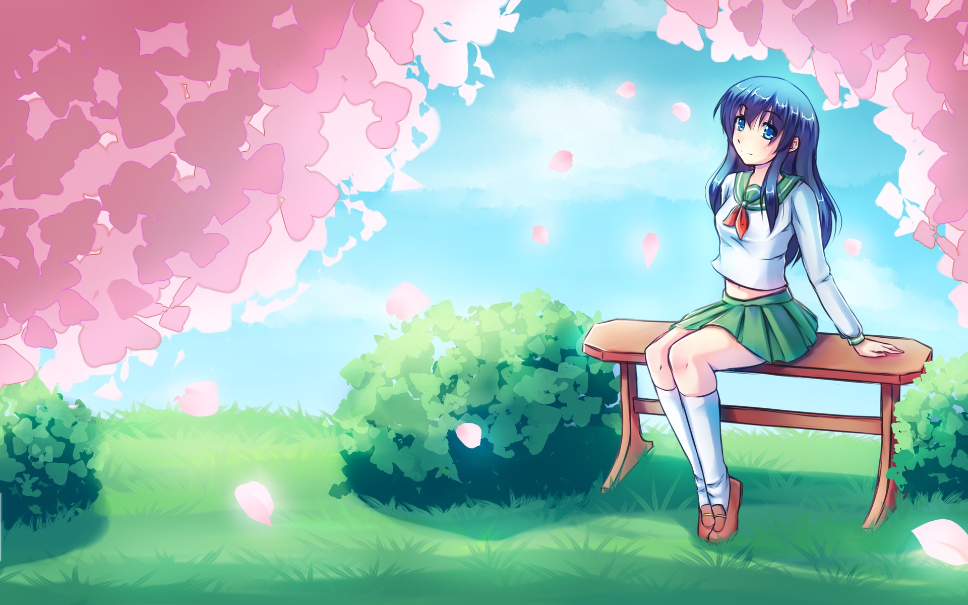 Fille de dessin animé dans le parc est assis sur un banc