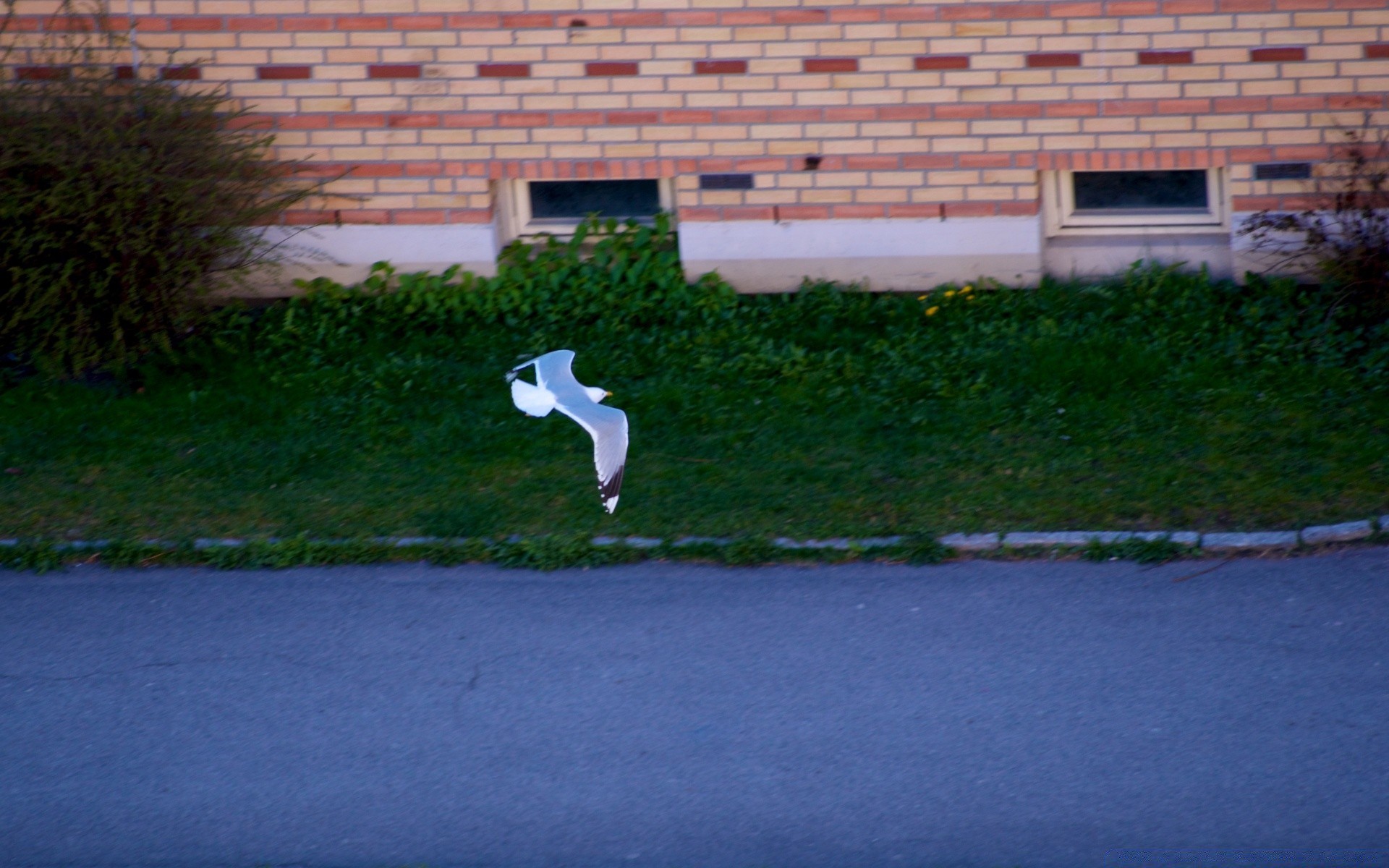 Mouette vole au-dessus de l'herbe à droite
