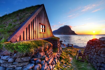 Maison en pierre sur la plage coucher de soleil