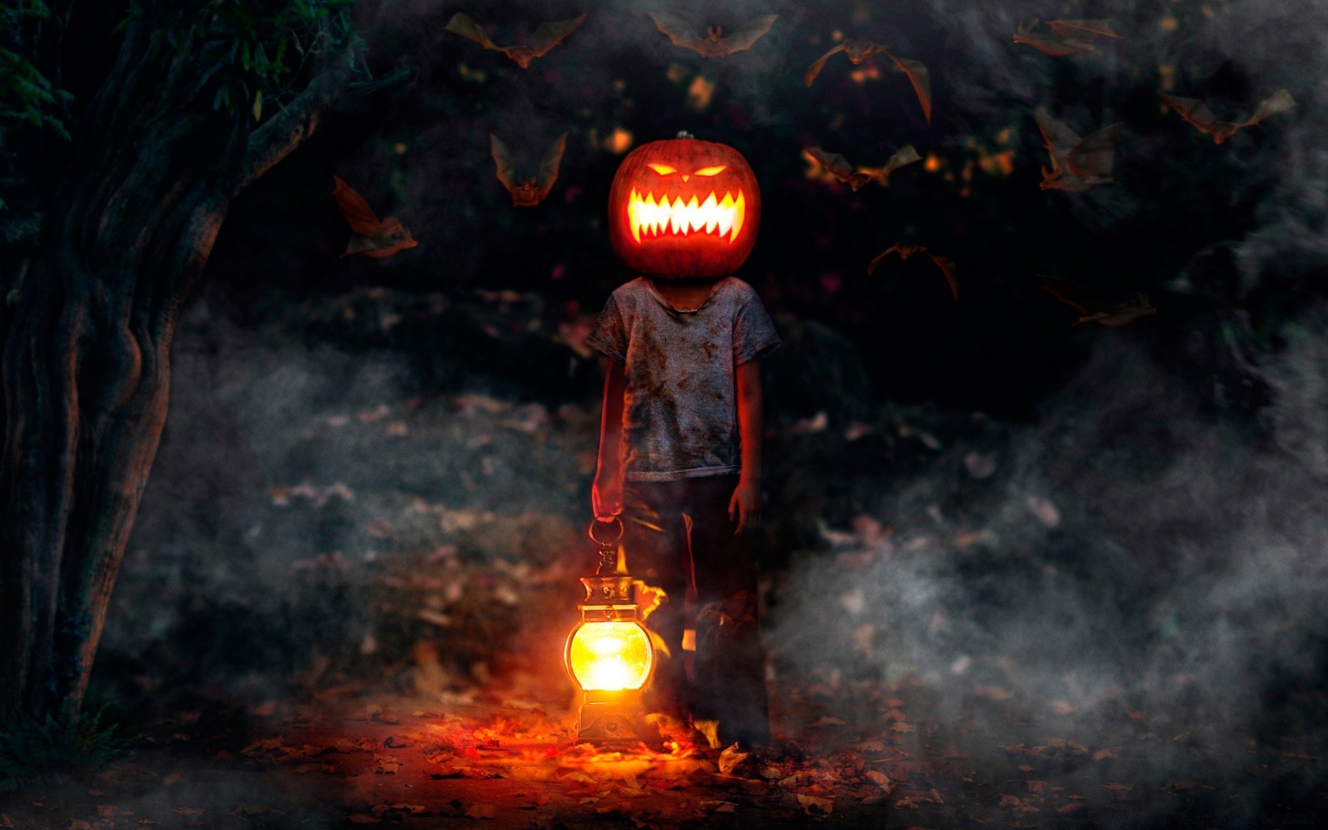 Homme avec une lanterne à la main et un masque en forme de citrouille