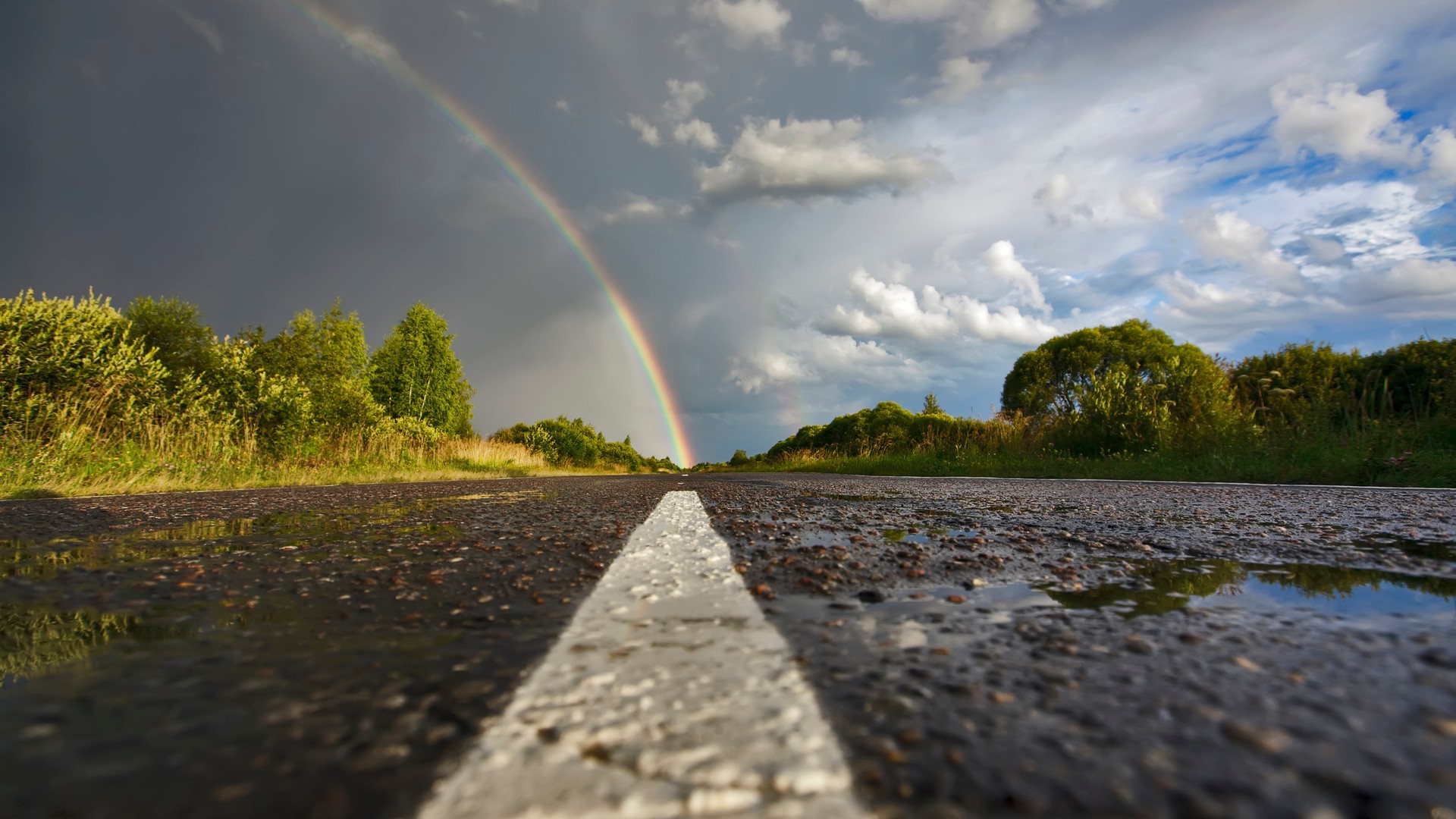 Route passant dans un arc-en-ciel et un ciel nuageux