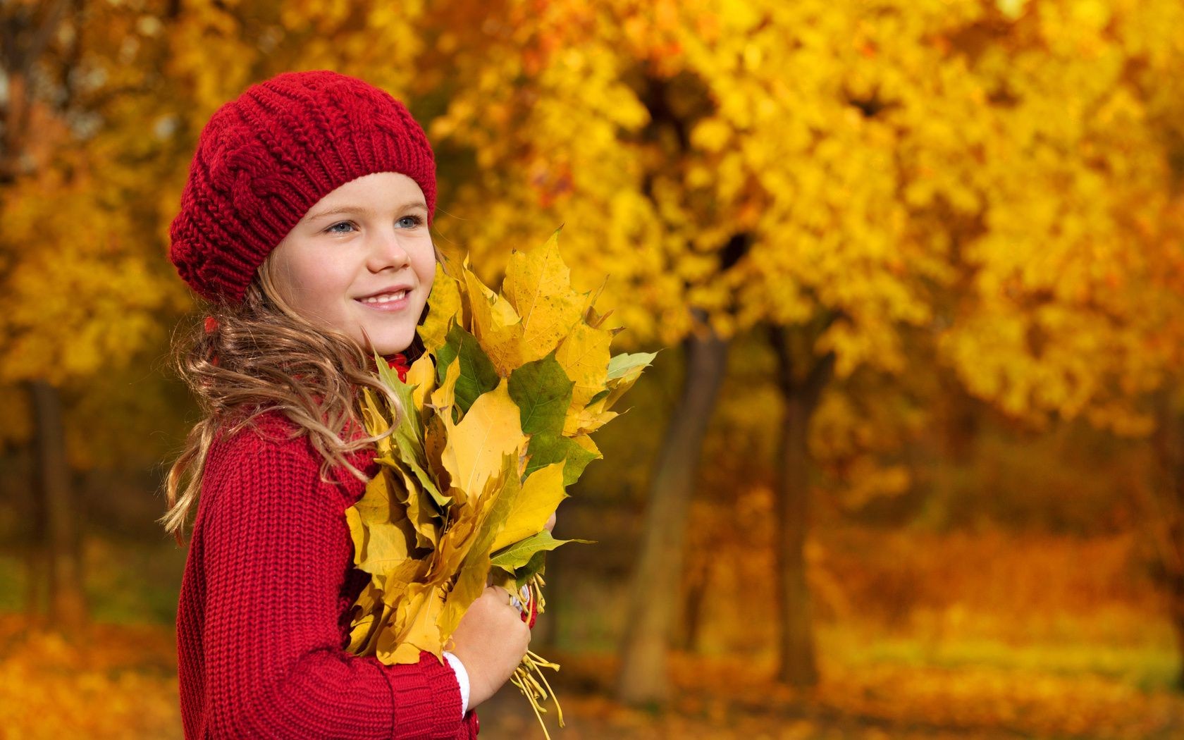 Fille dans la forêt d'automne avec une brassée de feuilles jaunes