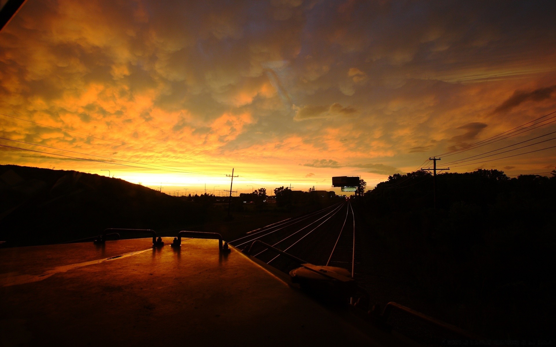 Le train de chemin de fer court le long de la voie ferrée, le ciel au-dessus de lui brille doucement, le bruit du coucher du soleil flotte dans le vent