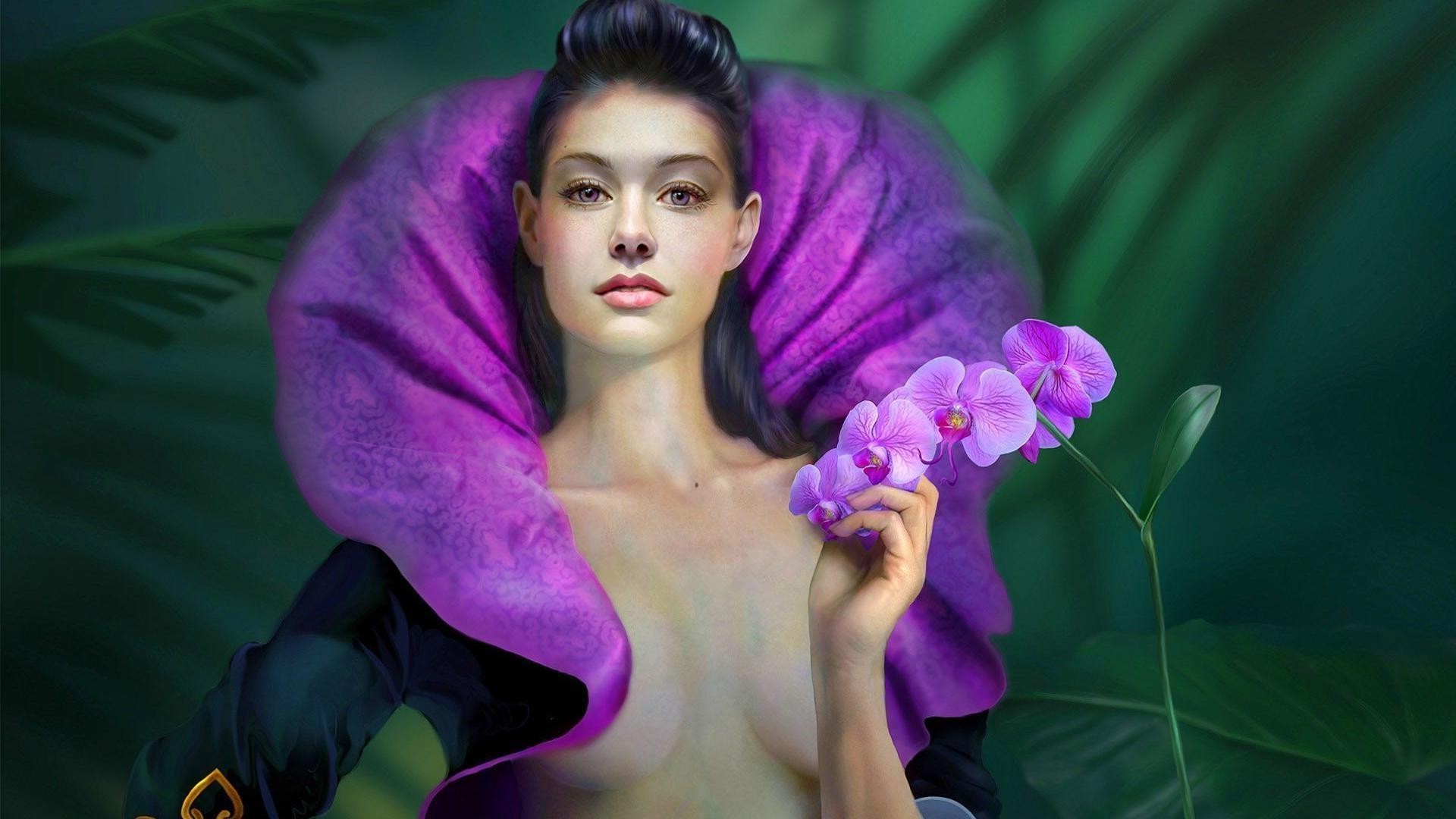 Dessin d'une fille dans un manteau lilas avec des orchidées