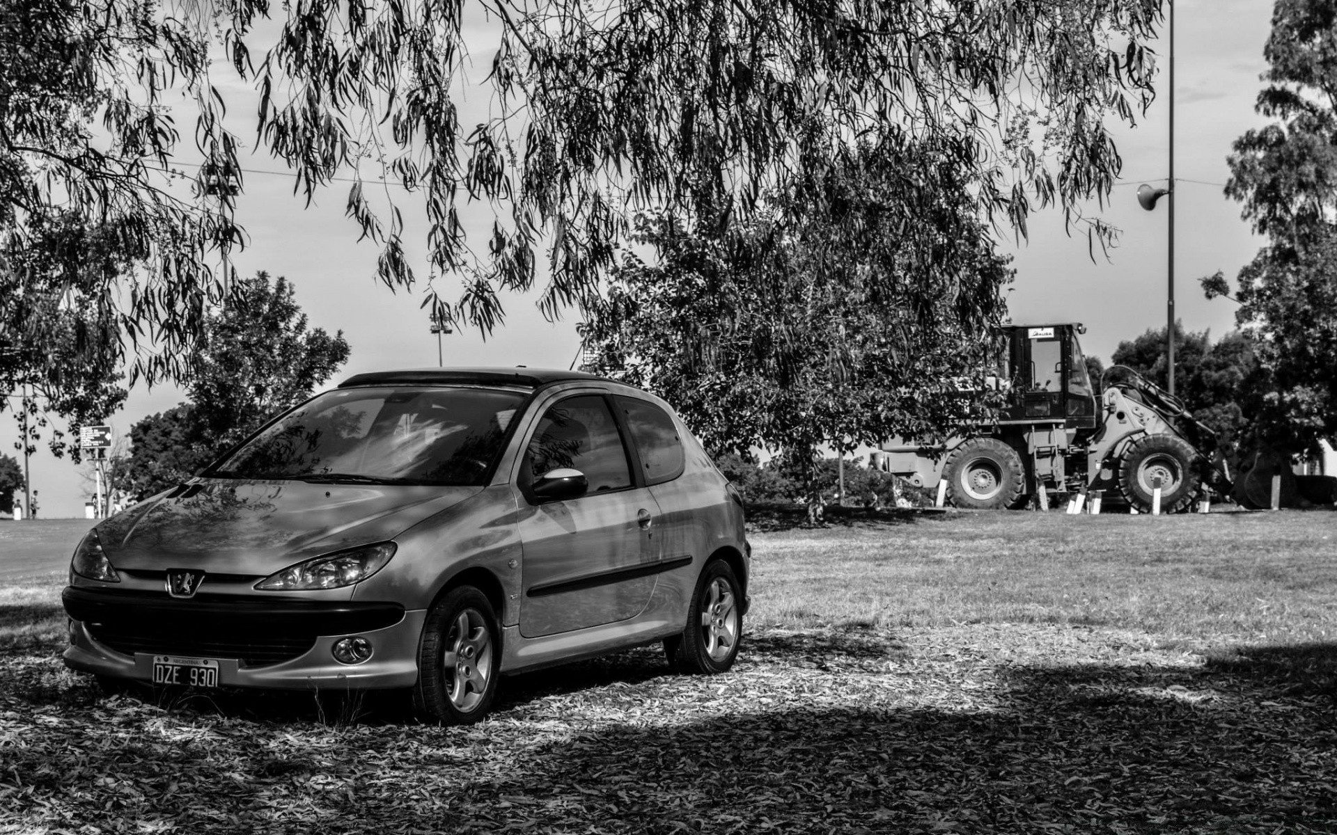 Photo en noir et blanc d'une voiture sous l'ombre d'un énorme arbre