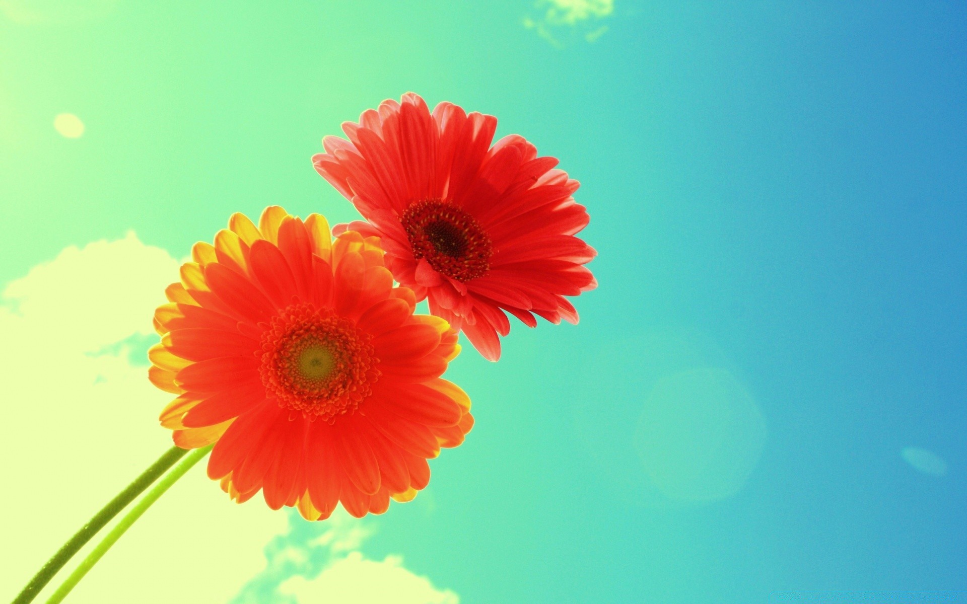 Deux fleurs de Gerber écarlate sur fond bleu