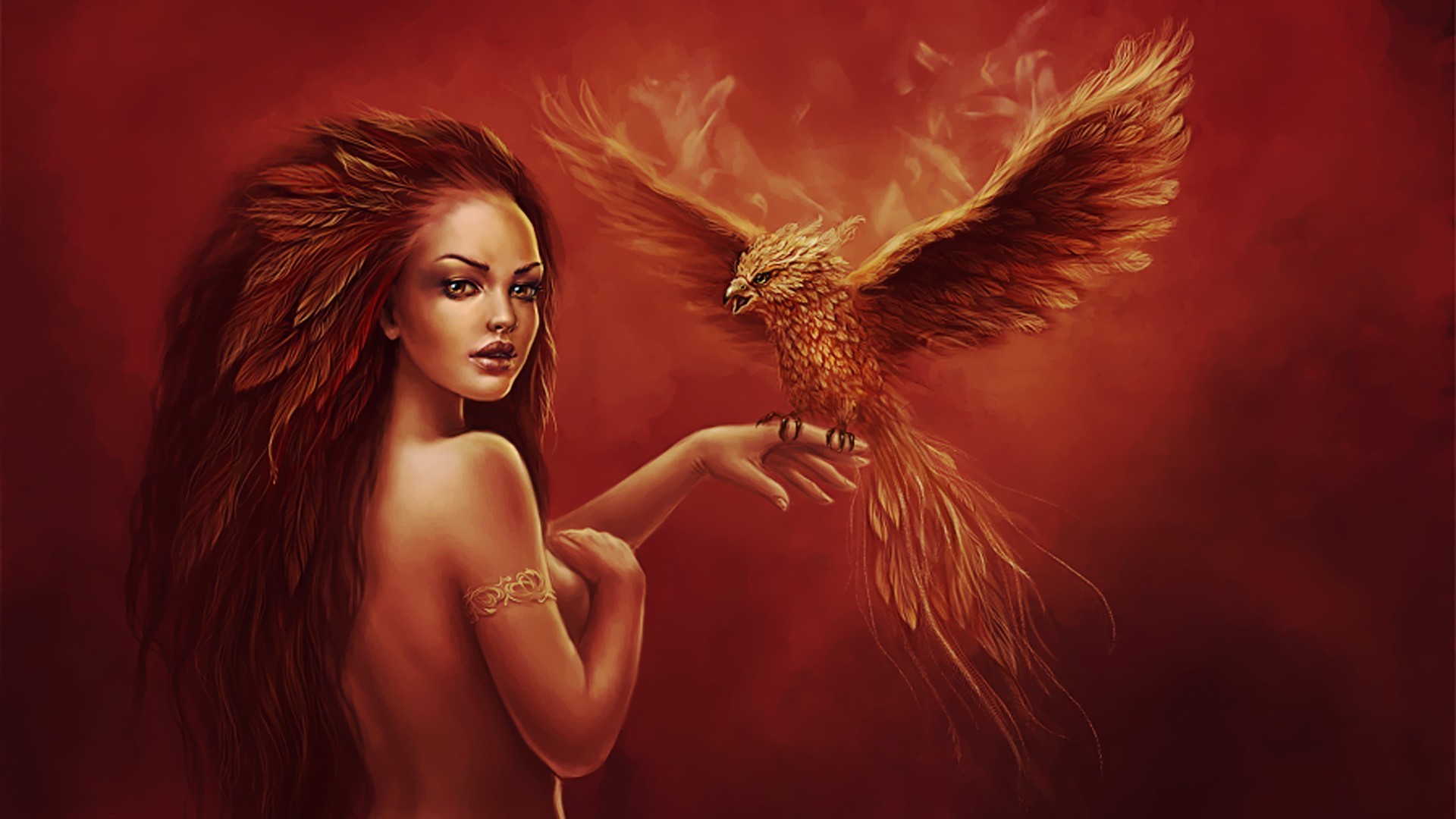 Fille avec un oiseau sur la main. oiseau Phoenix. oiseau fille