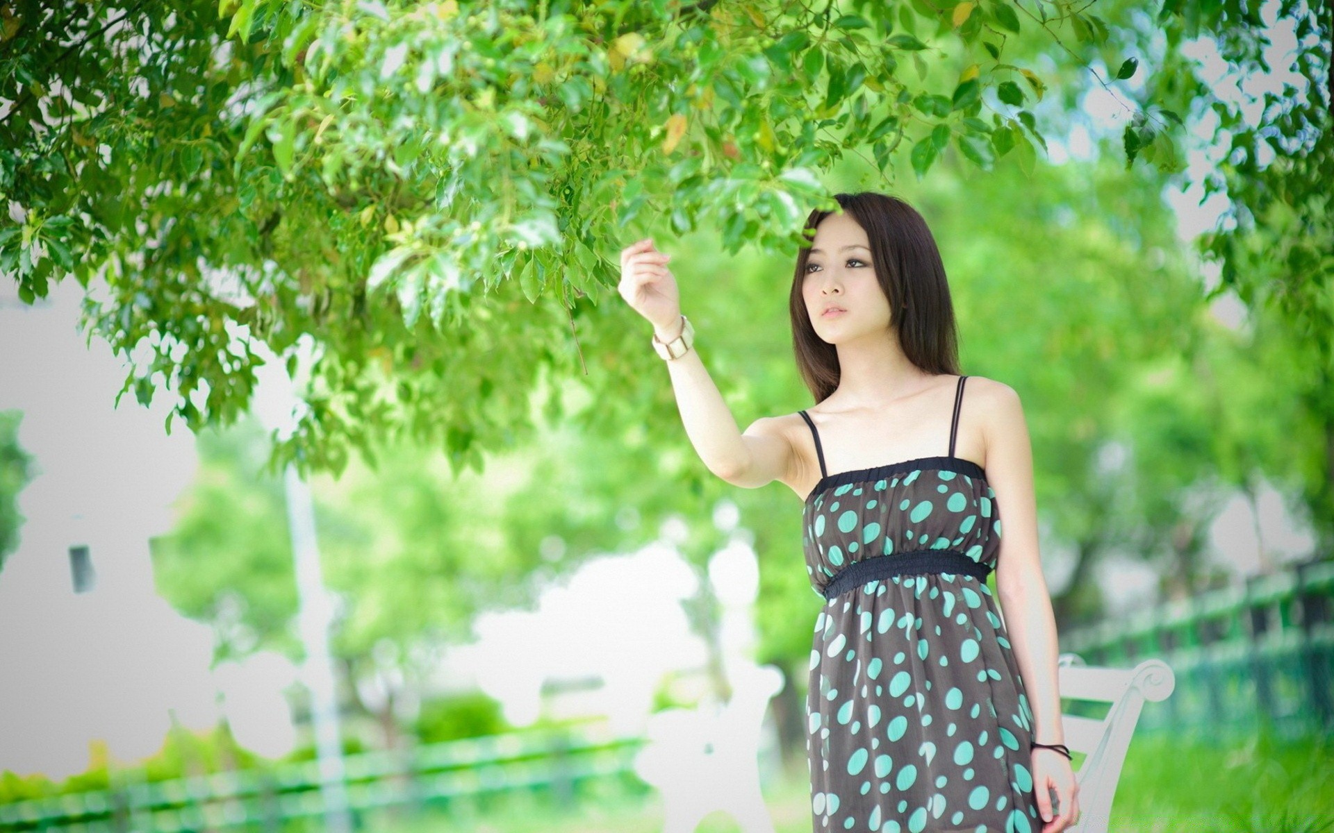 Fille aux cheveux longs se trouve et sourit dans l'herbe verte