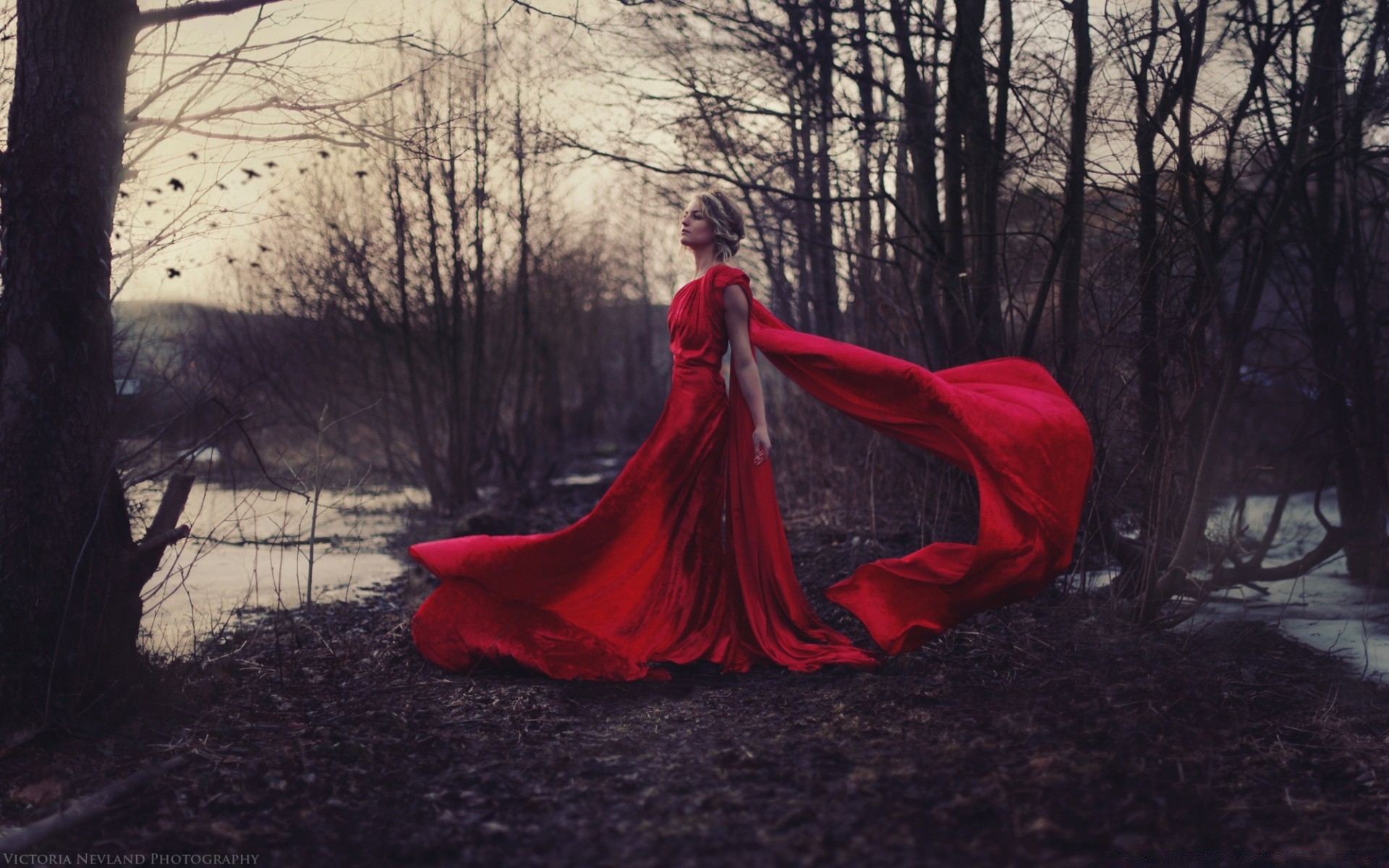 Fille en robe rouge sur fond de forêt à la fin de l automne