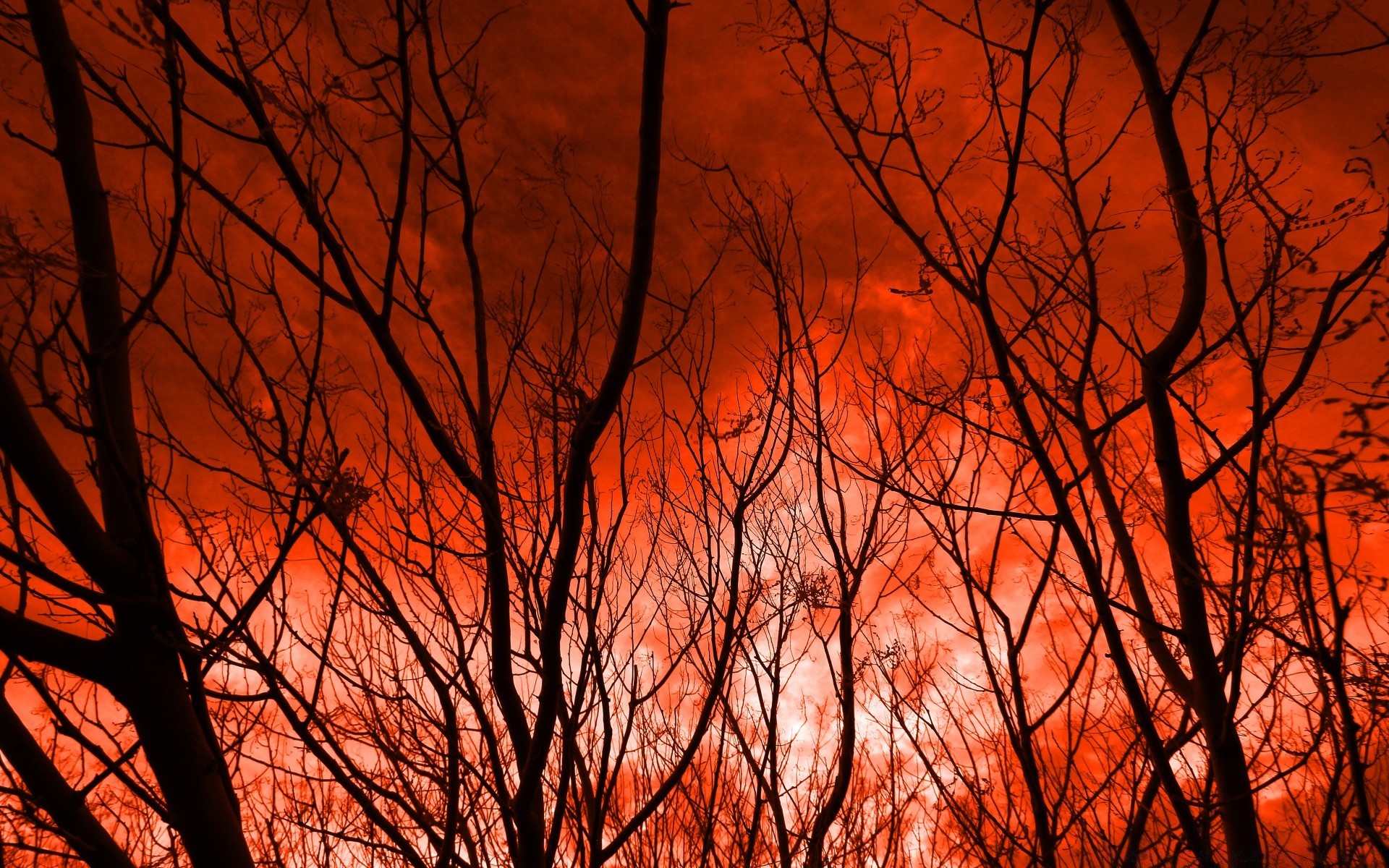 Un coucher de soleil rouge transperce les arbres
