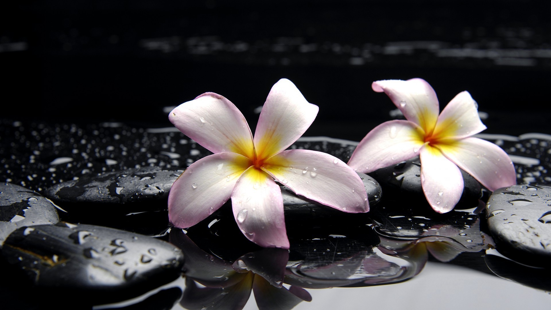 Image de deux délicates fleurs vivantes sur une surface humideImage de deux délicates fleurs vivantes sur une surface humide