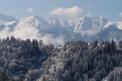 Paysage d'hiver de montagne avec forêt