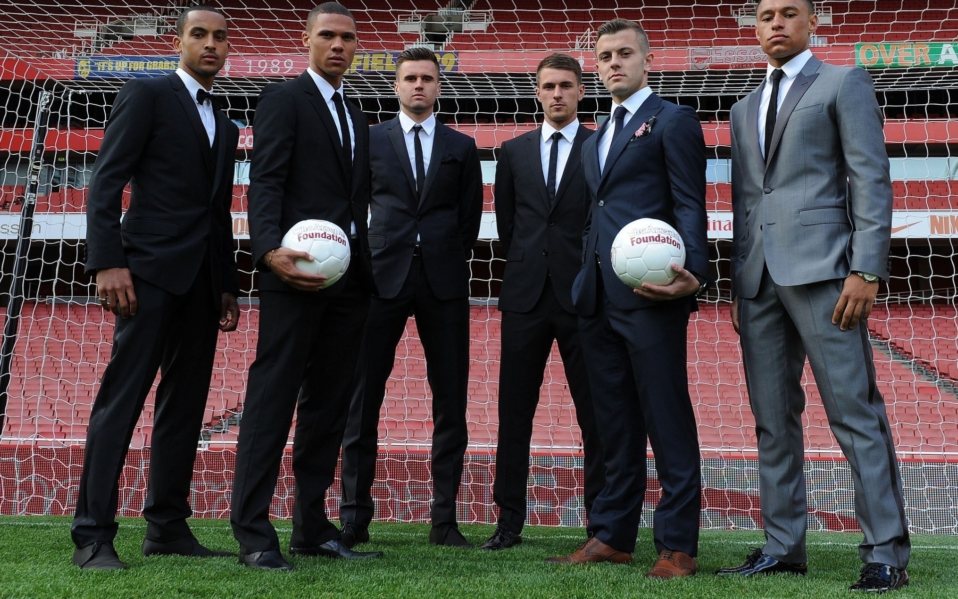 Footballeurs en costumes au stade