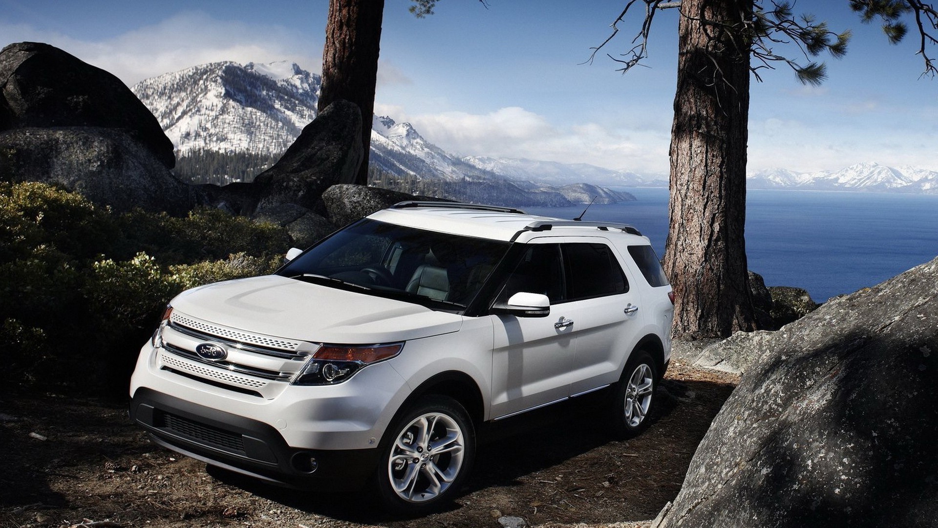Ford SUV blanc parmi la forêt sur fond de montagnes