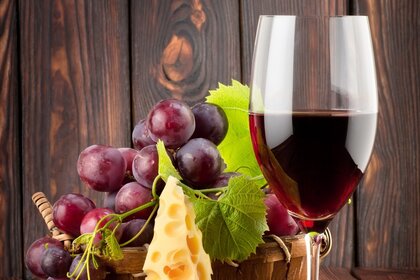 Nature morte avec des fruits et un verre de vin sur fond de plancheNature morte avec des fruits et un verre de vin sur fond de planche