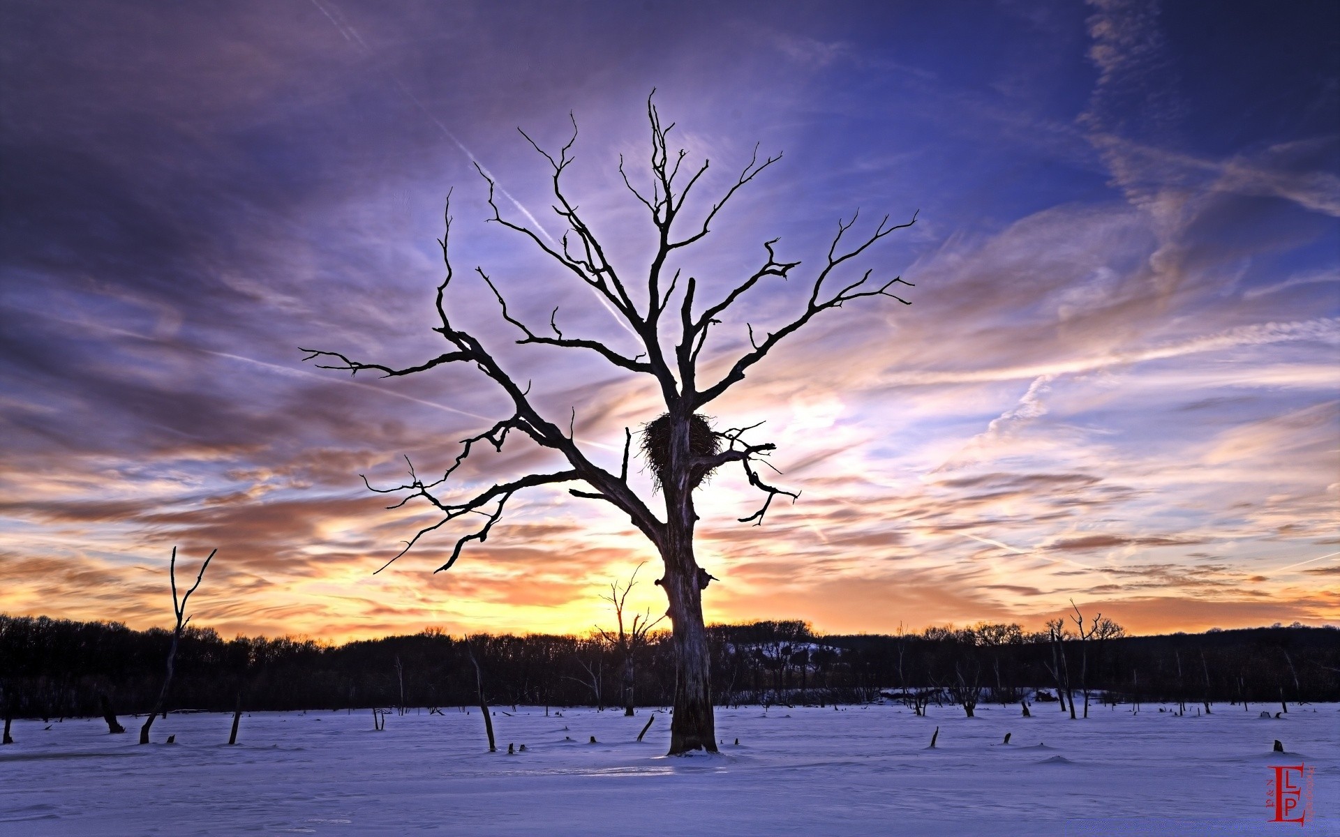Arbre nu mort au coucher du soleil dans un champ d hiver