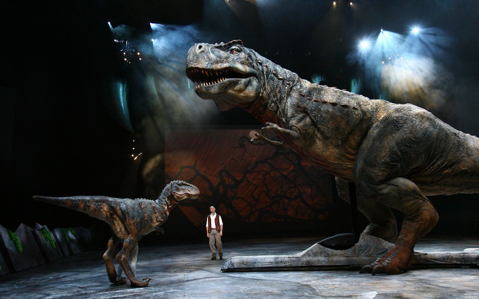 Homme à côté de statues de dinosaures