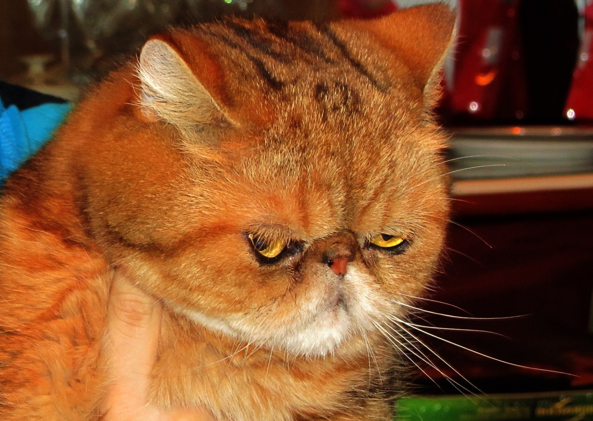 Chat rouge triste dans les mains d'un homme dans un environnement familial