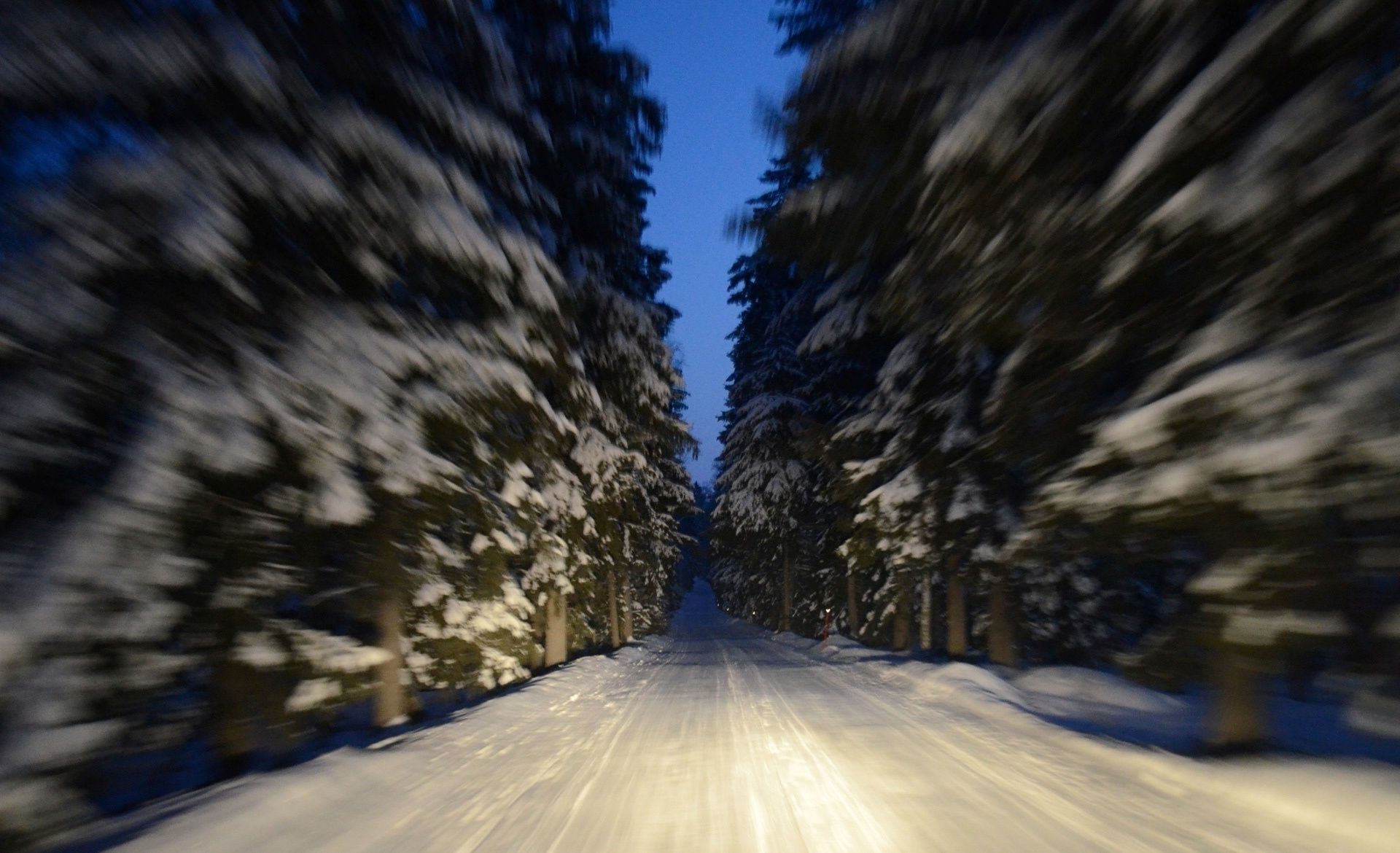 Traverser la forêt d'hiver à grande vitesse. Forêt d'hiver à la lumière des phares de voiture