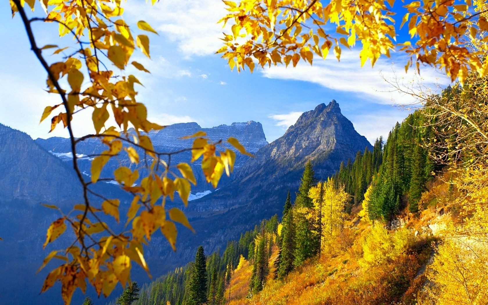 Arbre avec des feuilles jaunes entre la côte de pierre et de l'eau bleu-vert transparent sur fond de ciel bleu