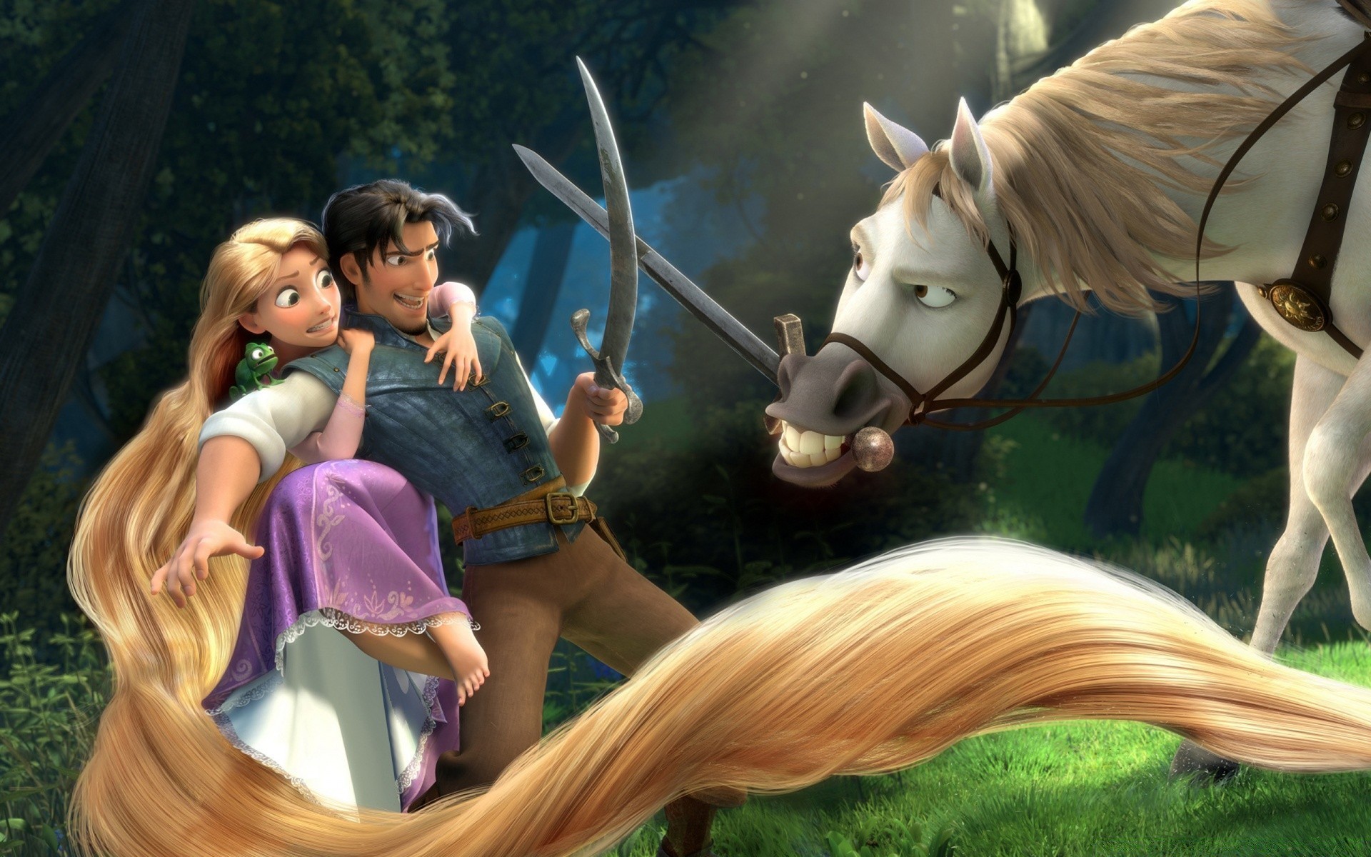 Raiponce aux cheveux longs. guy se bat avec un cheval