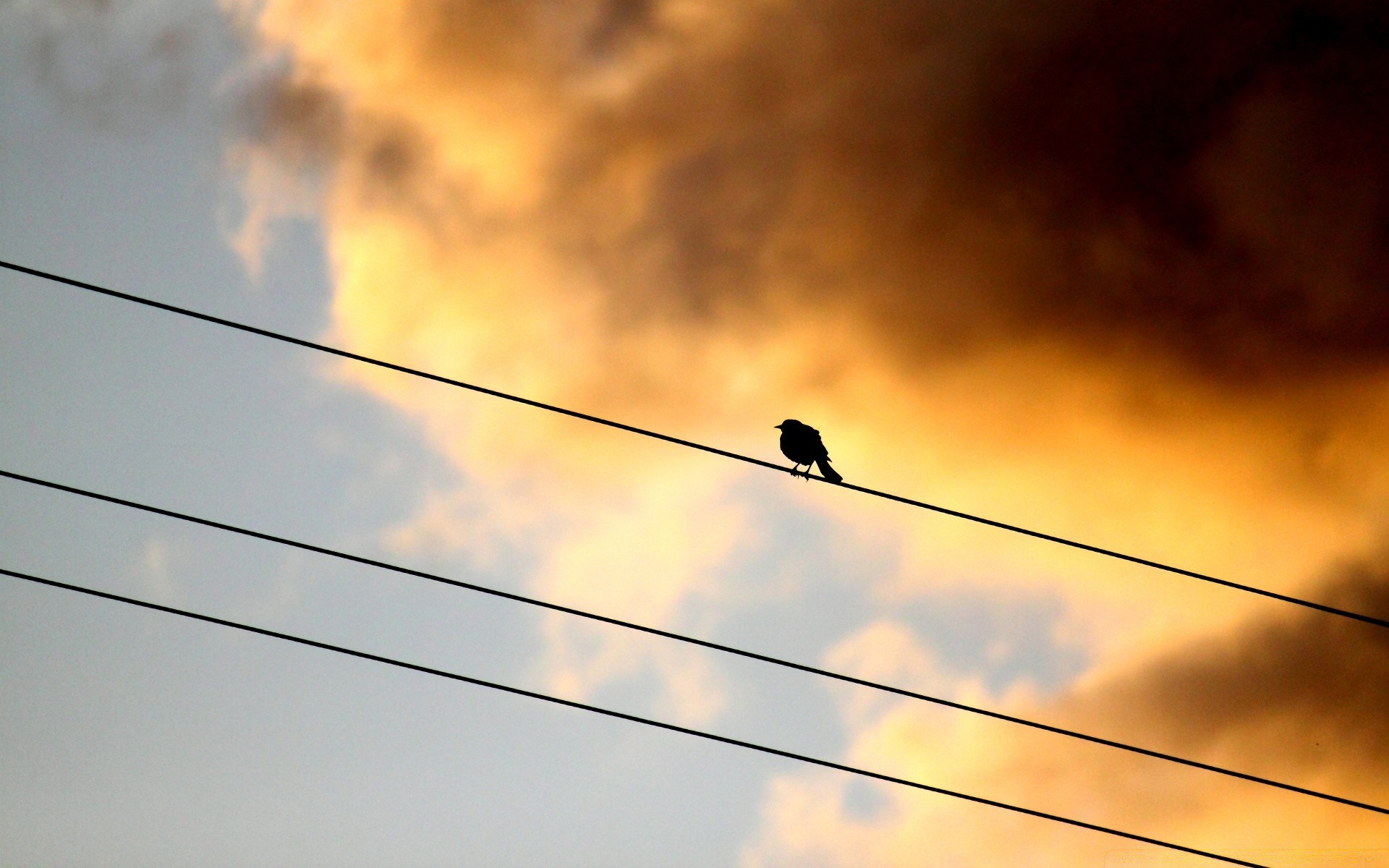 Moineau sur les fils sur fond de coucher de soleil