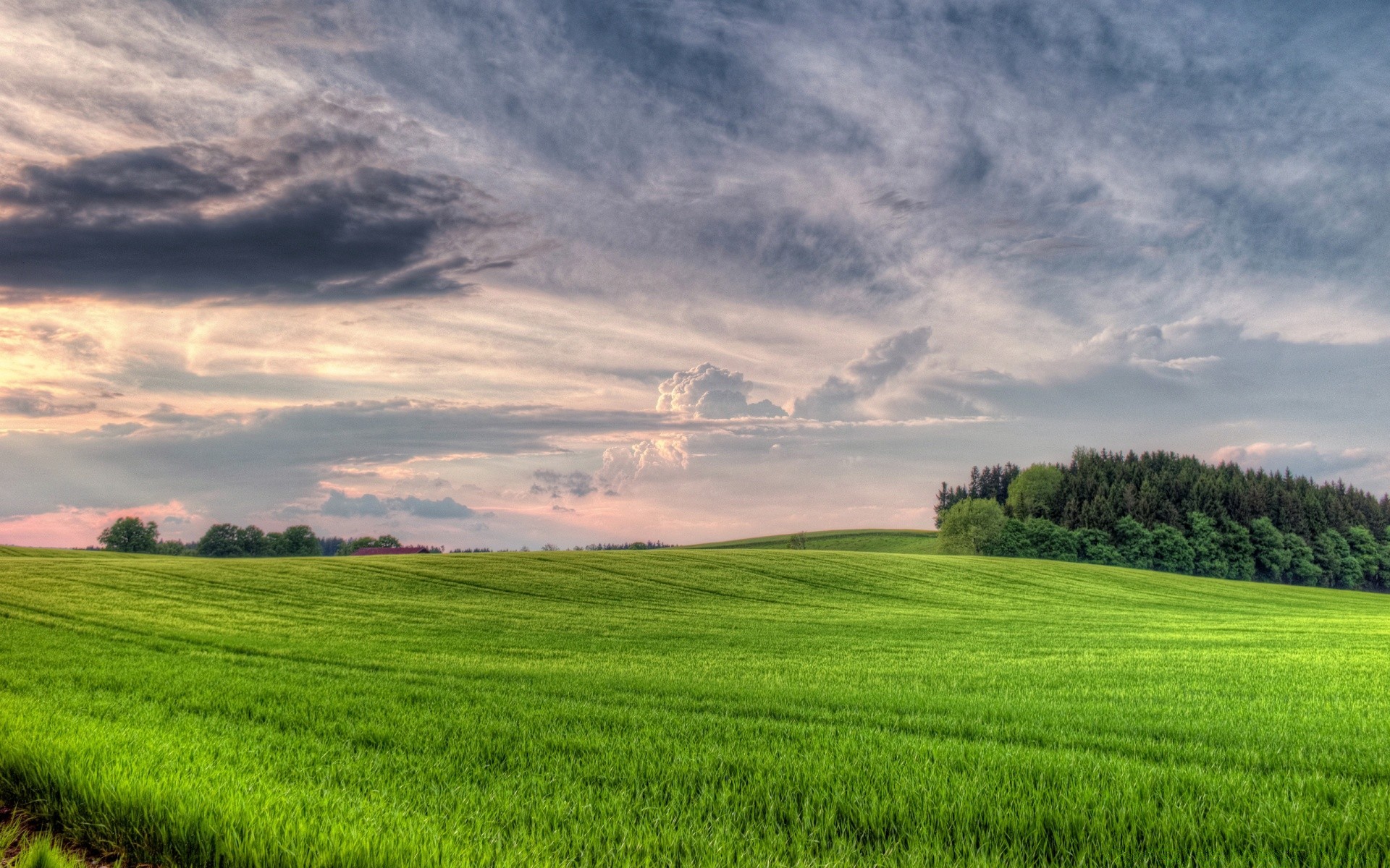 Champ d'été de nuages verts et blancs sur le ciel bleu