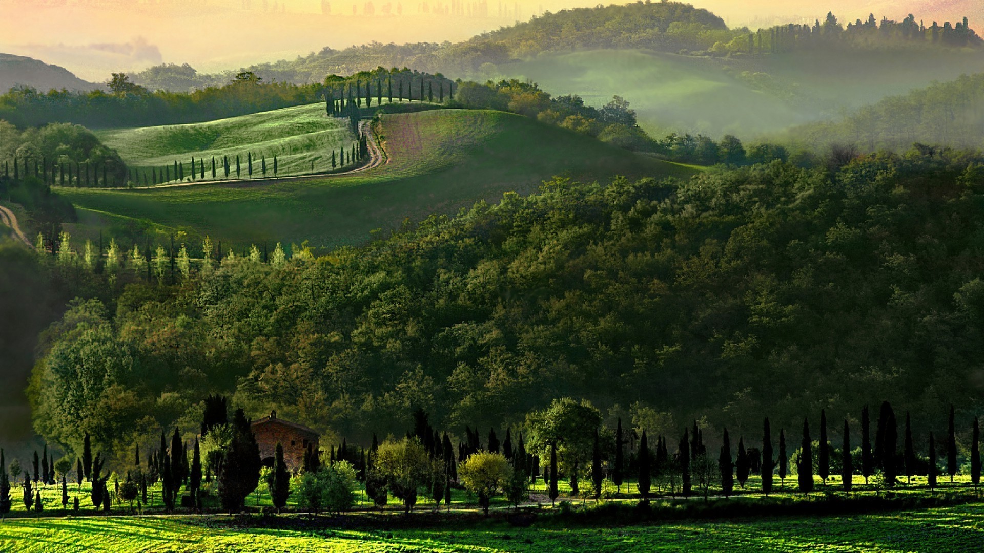 Image de la forêt verte d'izos sur laquelle se trouve l'herbe de la montagne et de la maison