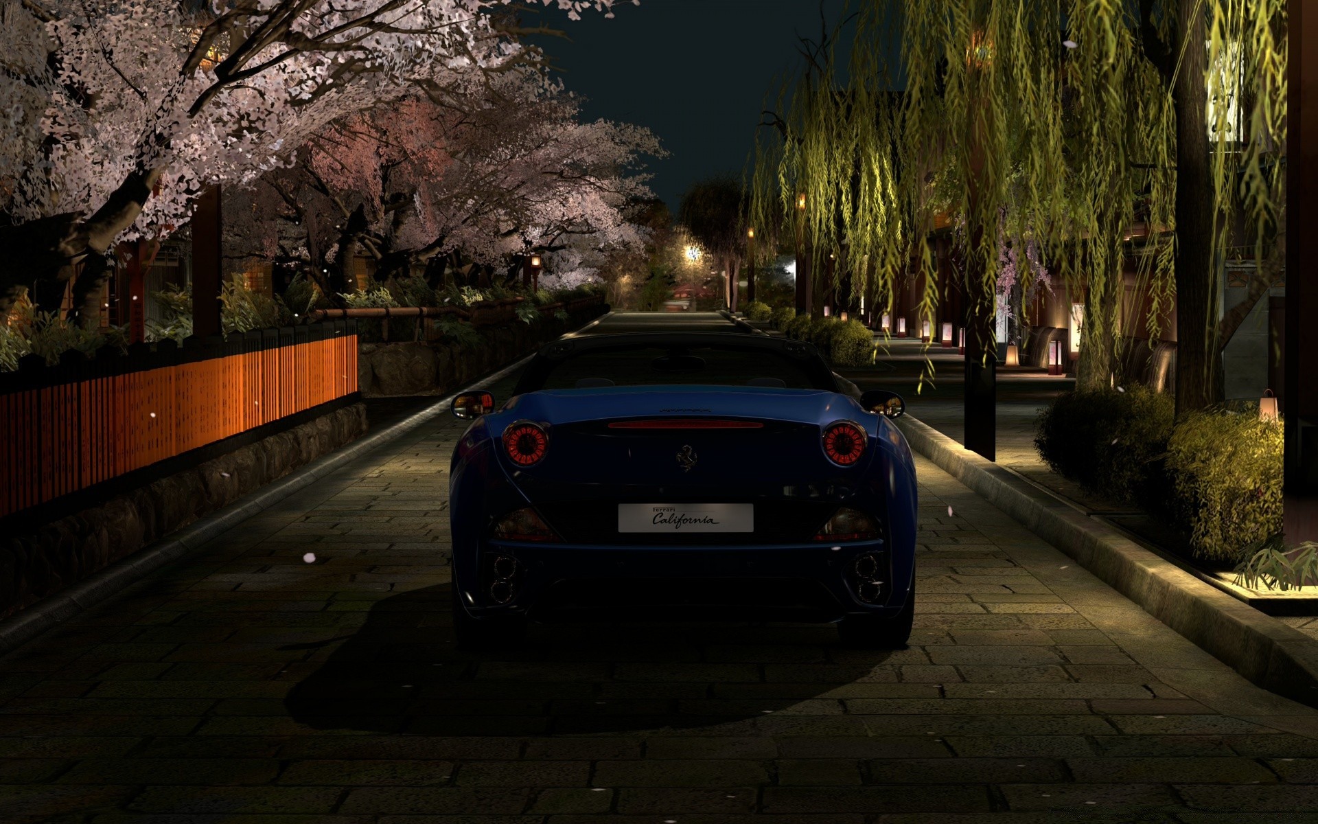 Voiture de couleur verte et arbres de cerisier
