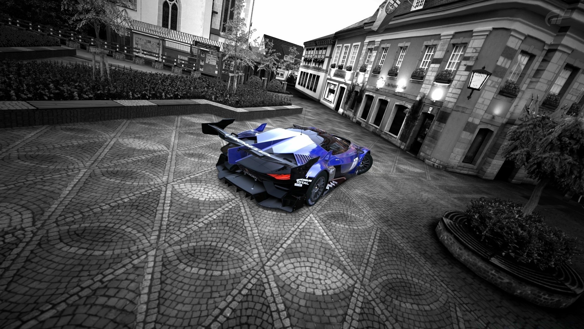Voiture de course bleue dans la ville grise