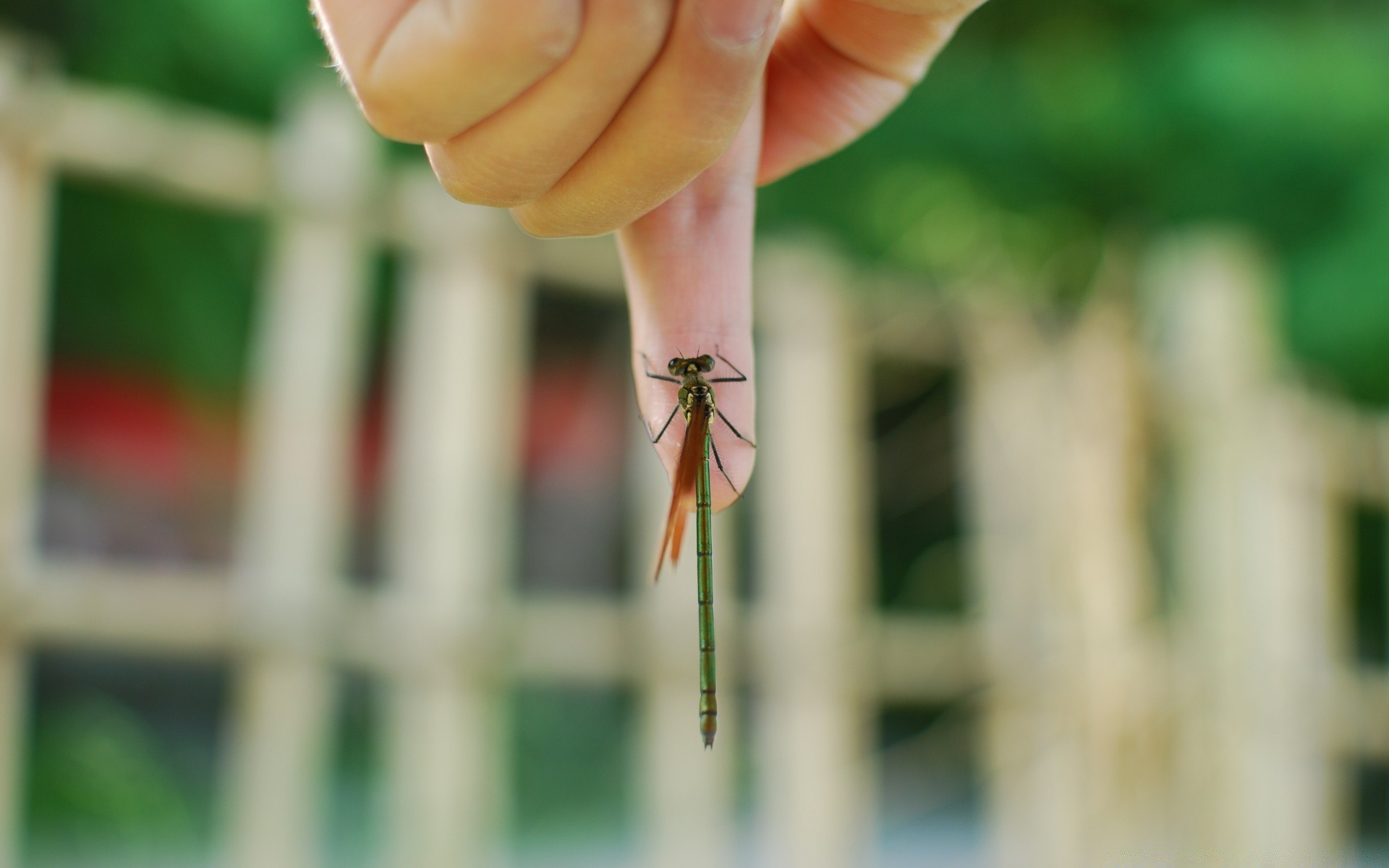 Libellule accroché au doigt de l'homme