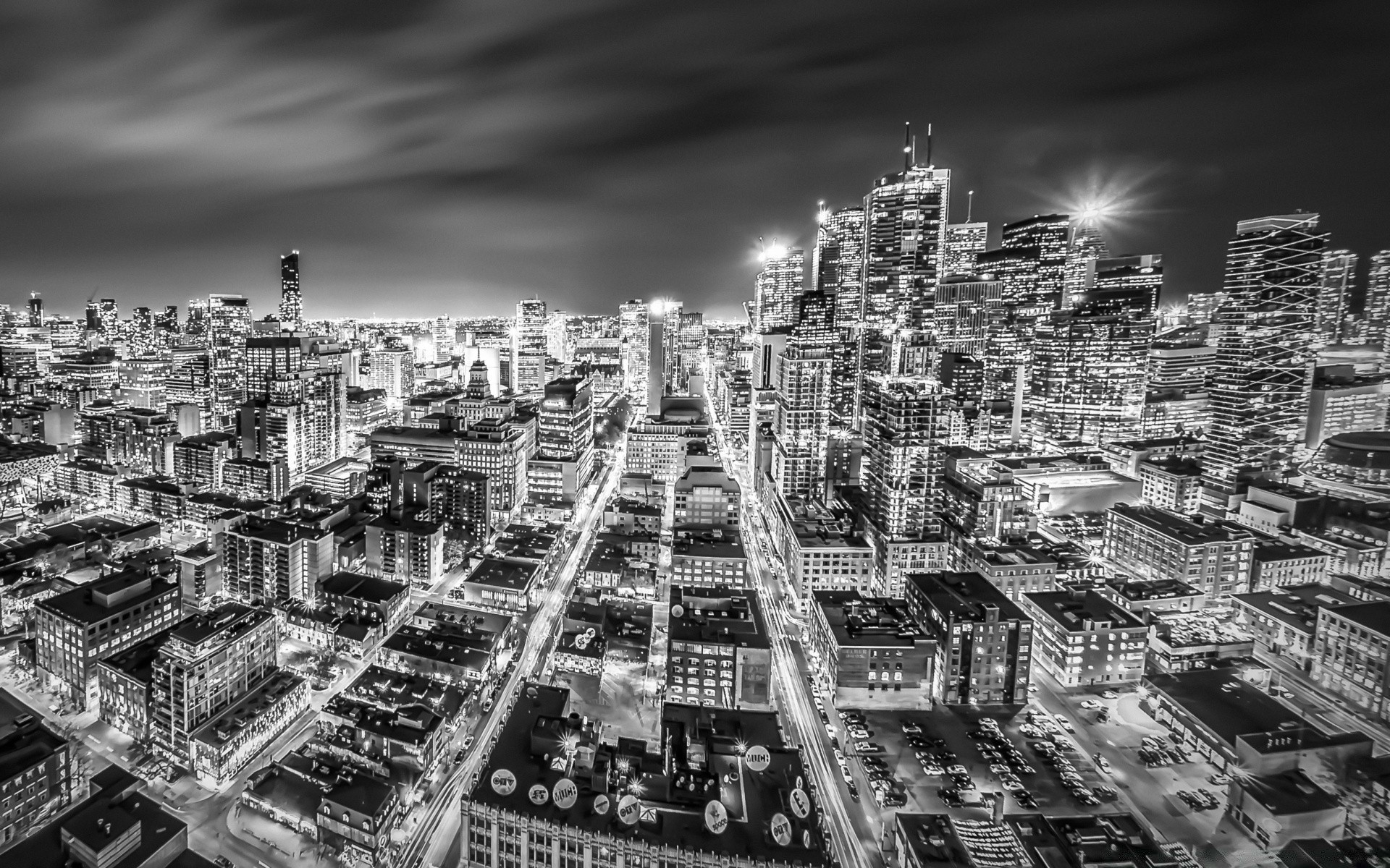 Photo en noir et blanc d'un paysage urbain avec des gratte-ciel