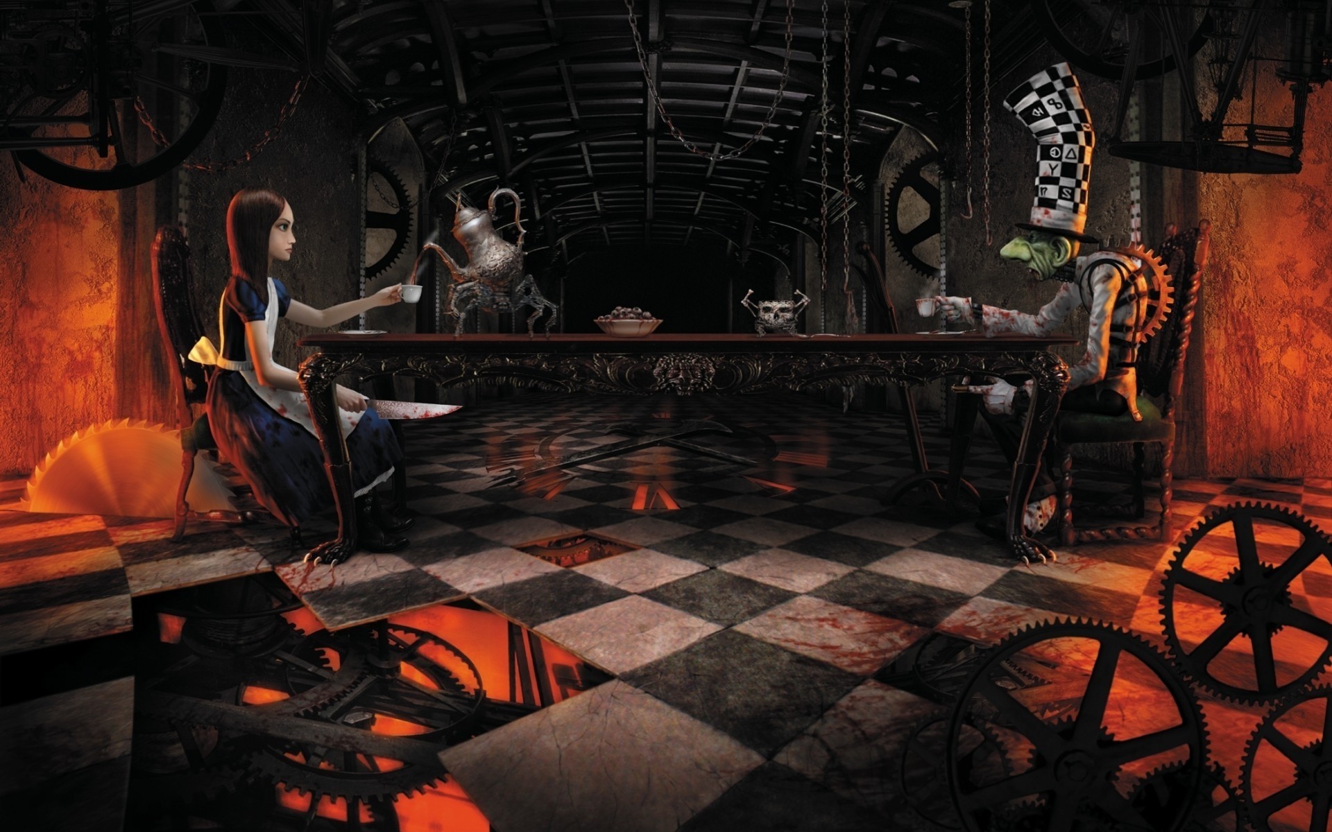 Personnages dans le jeu ensemble à la table dans une pièce sombre