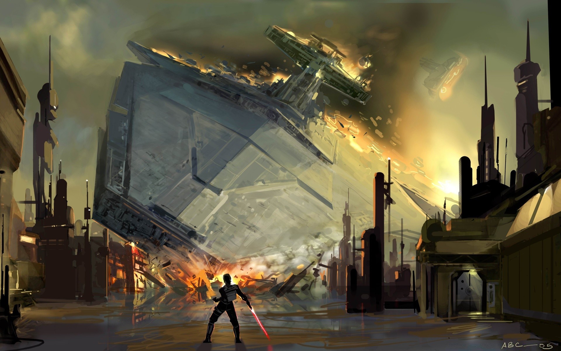 Guerrier sur fond de vaisseau spatial Effondré