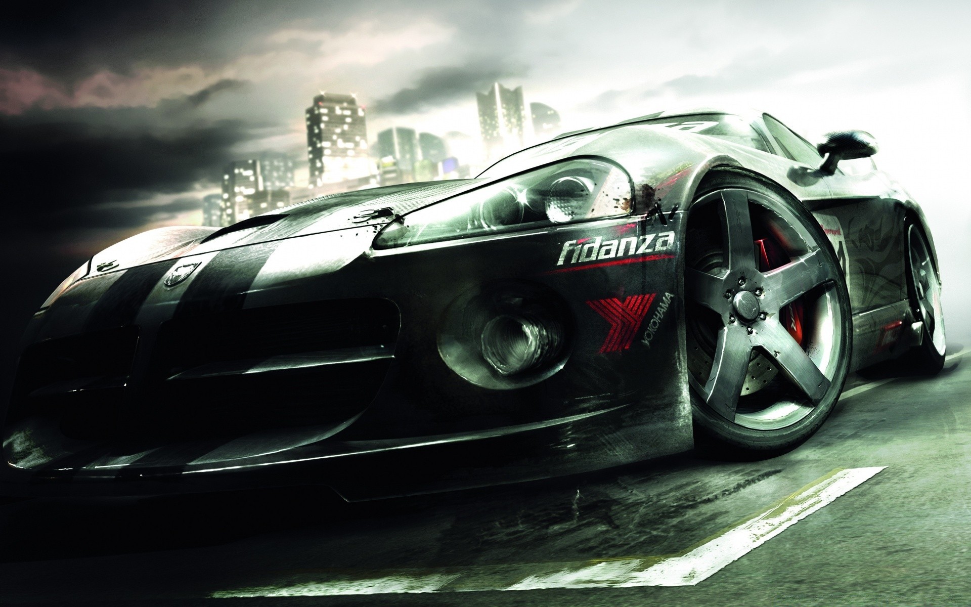 Voiture de sport sur la piste sur fond de gratte-ciel