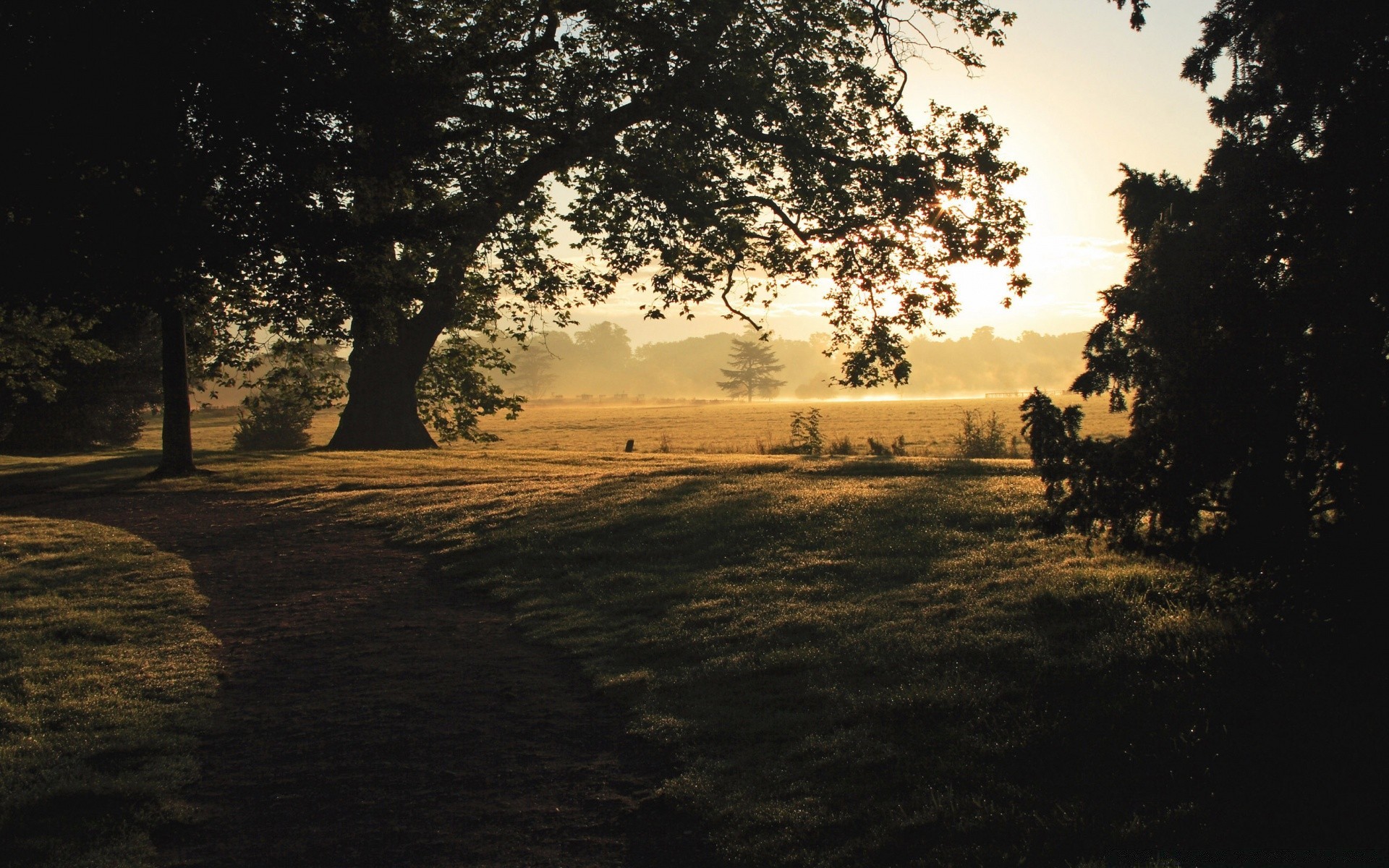 Paysage brumeux et mystérieux avec des champs et un doux soleilPaysage brumeux et mystérieux avec des champs et un doux soleil