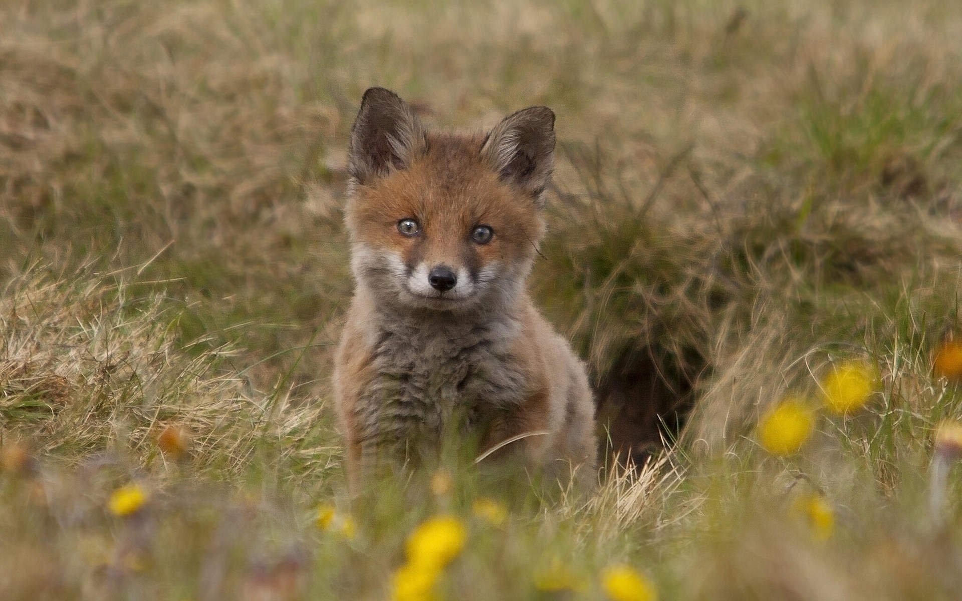 Renard furtivement derrière l'herbe dans la caméra